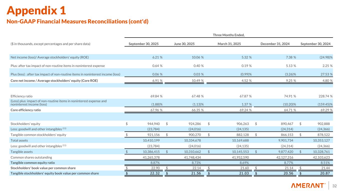 31 Three Months Ended, (in thousands, except percentages and per share data) September 30, 2025 June 30, 2025 March 31, 2025 December 31, 2024 September 30, 2024 Net income (loss) attributable to Amerant Bancorp Inc. $ 14,756 $ 23,002 $ 11,958 $ 16,881 $ (48,164) Plus after-tax non-routine items in noninterest expense: Non-routine items in noninterest expense before income tax effect 1,977 1,192 534 15,148 5,672 Income tax effect (9) (445) (272) (120) (3,409) (1,332) Total after-tax non-routine items in noninterest expense 1,532 920 414 11,739 4,340 Plus (less) after-tax non-routine items in noninterest income: Non-routine items in noninterest income (loss) before income tax effect 180 73 (2,863) (5,864) 68,484 Income tax effect (9) (43) (11) 644 (1,596) (15,411) Total after-tax non-routine items in noninterest income (loss) 137 62 (2,219) (7,460) 53,073 Core net income $ 16,425 $ 23,984 $ 10,153 $ 21,160 $ 9,249 Basic earnings (loss) per share $ 0.35 $ 0.55 $ 0.28 $ 0.40 $ (1.43) Plus: after tax impact of non-routine items in noninterest expense 0.04 0.02 0.01 0.28 0.13 (Less) plus: after tax impact of non-routine items in noninterest income (loss) — — (0.05) (0.18) 1.57 Total core basic earnings per common share $ 0.39 $ 0.57 $ 0.24 $ 0.50 $ 0.27 Diluted earnings (loss) per share (10) $ 0.35 $ 0.55 $ 0.28 $ 0.40 $ (1.43) Plus: after tax impact of non-routine items in noninterest expense 0.04 0.02 0.01 0.28 0.13 (Less) plus: after tax impact of non-routine items in noninterest income (loss) — — (0.05) (0.18) 1.57 Total core diluted earnings per common share $ 0.39 $ 0.57 $ 0.24 $ 0.50 $ 0.27 Net income (loss) / Average total assets (ROA) 0.57 % 0.90 % 0.48 % 0.67 % (1.92) % Plus: after tax impact of non-routine items in noninterest expense 0.06 % 0.04 % 0.02 % 0.46 % 0.18 % (Less) plus: after tax impact of non-routine items in noninterest income (loss) 0.01 % — % (0.09) % (0.30) % 2.11 % Core net income / Average total assets (Core ROA) 0.64 % 0.94 % 0.41 % 0.83 % 0.37 % Appendix 1 Non-GAAP Financial Measures Reconciliations (cont'd)