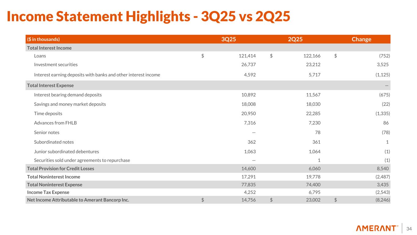 34 Income Statement Highlights - 3Q25 vs 2Q25 ($ in thousands) 3Q25 2Q25 Change Total Interest Income Loans $ 121,414 $ 122,166 $ (752) Investment securities 26,737 23,212 3,525 Interest earning deposits with banks and other interest income 4,592 5,717 (1,125) Total Interest Expense — Interest bearing demand deposits 10,892 11,567 (675) Savings and money market deposits 18,008 18,030 (22) Time deposits 20,950 22,285 (1,335) Advances from FHLB 7,316 7,230 86 Senior notes — 78 (78) Subordinated notes 362 361 1 Junior subordinated debentures 1,063 1,064 (1) Securities sold under agreements to repurchase — 1 (1) Total Provision for Credit Losses 14,600 6,060 8,540 Total Noninterest Income 17,291 19,778 (2,487) Total Noninterest Expense 77,835 74,400 3,435 Income Tax Expense 4,252 6,795 (2,543) Net Income Attributable to Amerant Bancorp Inc. $ 14,756 $ 23,002 $ (8,246)