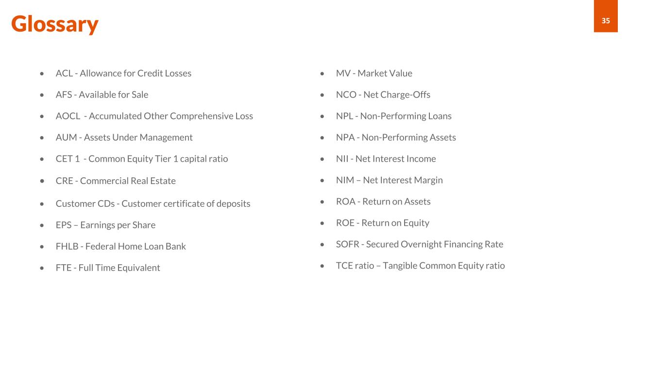 35 • ACL - Allowance for Credit Losses • AFS - Available for Sale • AOCL - Accumulated Other Comprehensive Loss • AUM - Assets Under Management • CET 1 - Common Equity Tier 1 capital ratio • CRE - Commercial Real Estate • Customer CDs - Customer certificate of deposits • EPS – Earnings per Share • FHLB - Federal Home Loan Bank • FTE - Full Time Equivalent • MV - Market Value • NCO - Net Charge-Offs • NPL - Non-Performing Loans • NPA - Non-Performing Assets • NII - Net Interest Income • NIM – Net Interest Margin • ROA - Return on Assets • ROE - Return on Equity • SOFR - Secured Overnight Financing Rate • TCE ratio – Tangible Common Equity ratio Glossary