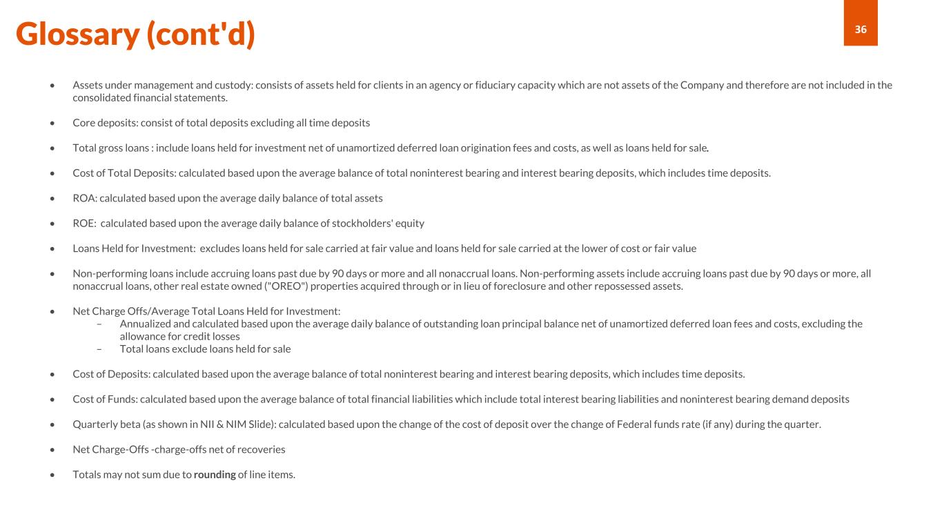 36Glossary (cont'd) • Assets under management and custody: consists of assets held for clients in an agency or fiduciary capacity which are not assets of the Company and therefore are not included in the consolidated financial statements. • Core deposits: consist of total deposits excluding all time deposits • Total gross loans : include loans held for investment net of unamortized deferred loan origination fees and costs, as well as loans held for sale. • Cost of Total Deposits: calculated based upon the average balance of total noninterest bearing and interest bearing deposits, which includes time deposits. • ROA: calculated based upon the average daily balance of total assets • ROE: calculated based upon the average daily balance of stockholders' equity • Loans Held for Investment: excludes loans held for sale carried at fair value and loans held for sale carried at the lower of cost or fair value • Non-performing loans include accruing loans past due by 90 days or more and all nonaccrual loans. Non-performing assets include accruing loans past due by 90 days or more, all nonaccrual loans, other real estate owned ("OREO") properties acquired through or in lieu of foreclosure and other repossessed assets. • Net Charge Offs/Average Total Loans Held for Investment: – Annualized and calculated based upon the average daily balance of outstanding loan principal balance net of unamortized deferred loan fees and costs, excluding the allowance for credit losses – Total loans exclude loans held for sale • Cost of Deposits: calculated based upon the average balance of total noninterest bearing and interest bearing deposits, which includes time deposits. • Cost of Funds: calculated based upon the average balance of total financial liabilities which include total interest bearing liabilities and noninterest bearing demand deposits • Quarterly beta (as shown in NII & NIM Slide): calculated based upon the change of the cost of deposit over the change of Federal funds rate (if any) during the quarter. • Net Charge-Offs -charge-offs net of recoveries • Totals may not sum due to rounding of line items.
