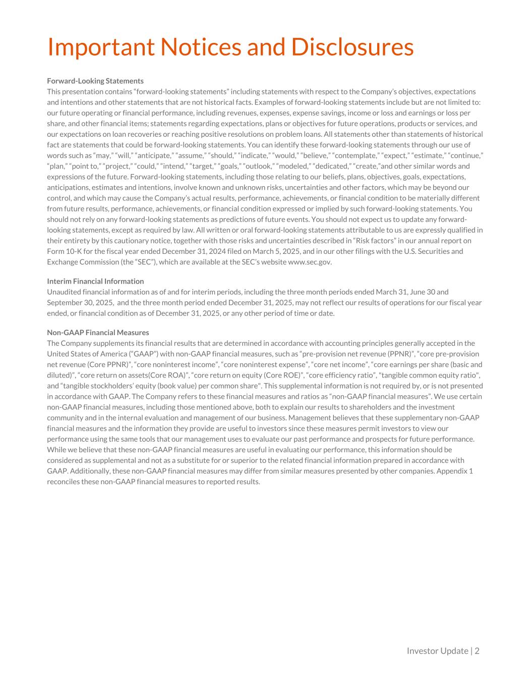 Important Notices and Disclosures Forward-Looking Statements This presentation contains “forward-looking statements” including statements with respect to the Company’s objectives, expectations and intentions and other statements that are not historical facts. Examples of forward-looking statements include but are not limited to: our future operating or financial performance, including revenues, expenses, expense savings, income or loss and earnings or loss per share, and other financial items; statements regarding expectations, plans or objectives for future operations, products or services, and our expectations on loan recoveries or reaching positive resolutions on problem loans. All statements other than statements of historical fact are statements that could be forward-looking statements. You can identify these forward-looking statements through our use of words such as “may,” “will,” “anticipate,” “assume,” “should,” “indicate,” “would,” “believe,” “contemplate,” “expect,” “estimate,” “continue,” “plan,” “point to,” “project,” “could,” “intend,” “target,” “goals,” “outlook,” “modeled,” “dedicated,” “create,”and other similar words and expressions of the future. Forward-looking statements, including those relating to our beliefs, plans, objectives, goals, expectations, anticipations, estimates and intentions, involve known and unknown risks, uncertainties and other factors, which may be beyond our control, and which may cause the Company’s actual results, performance, achievements, or financial condition to be materially different from future results, performance, achievements, or financial condition expressed or implied by such forward-looking statements. You should not rely on any forward-looking statements as predictions of future events. You should not expect us to update any forward- looking statements, except as required by law. All written or oral forward-looking statements attributable to us are expressly qualified in their entirety by this cautionary notice, together with those risks and uncertainties described in “Risk factors” in our annual report on Form 10-K for the fiscal year ended December 31, 2024 filed on March 5, 2025, and in our other filings with the U.S. Securities and Exchange Commission (the “SEC”), which are available at the SEC’s website www.sec.gov. Interim Financial Information Unaudited financial information as of and for interim periods, including the three month periods ended March 31, June 30 and September 30, 2025, and the three month period ended December 31, 2025, may not reflect our results of operations for our fiscal year ended, or financial condition as of December 31, 2025, or any other period of time or date. Non-GAAP Financial Measures The Company supplements its financial results that are determined in accordance with accounting principles generally accepted in the United States of America (“GAAP”) with non-GAAP financial measures, such as “pre-provision net revenue (PPNR)”, “core pre-provision net revenue (Core PPNR)”, “core noninterest income”, “core noninterest expense”, “core net income”, “core earnings per share (basic and diluted)”, “core return on assets(Core ROA)”, “core return on equity (Core ROE)”, “core efficiency ratio”, "tangible common equity ratio", and “tangible stockholders’ equity (book value) per common share". This supplemental information is not required by, or is not presented in accordance with GAAP. The Company refers to these financial measures and ratios as “non-GAAP financial measures”. We use certain non-GAAP financial measures, including those mentioned above, both to explain our results to shareholders and the investment community and in the internal evaluation and management of our business. Management believes that these supplementary non-GAAP financial measures and the information they provide are useful to investors since these measures permit investors to view our performance using the same tools that our management uses to evaluate our past performance and prospects for future performance. While we believe that these non-GAAP financial measures are useful in evaluating our performance, this information should be considered as supplemental and not as a substitute for or superior to the related financial information prepared in accordance with GAAP. Additionally, these non-GAAP financial measures may differ from similar measures presented by other companies. Appendix 1 reconciles these non-GAAP financial measures to reported results. Investor Update | 2