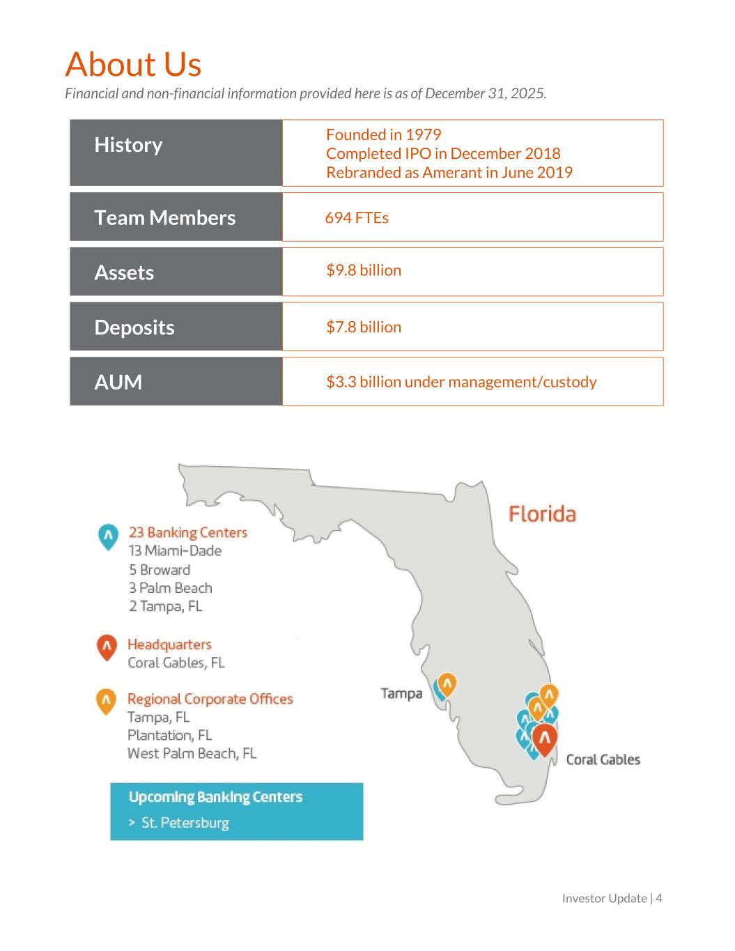 About Us Financial and non-financial information provided here is as of December 31, 2025. History Founded in 1979 Completed IPO in December 2018 Rebranded as Amerant in June 2019 Team Members 694 FTEs Assets $9.8 billion Deposits $7.8 billion AUM $3.3 billion under management/custody Investor Update | 4
