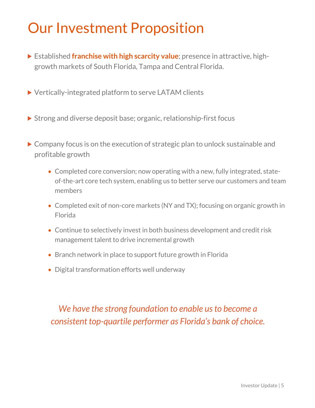 Our Investment Proposition Established franchise with high scarcity value; presence in attractive, high- growth markets of South Florida, Tampa and Central Florida. Vertically-integrated platform to serve LATAM clients Strong and diverse deposit base; organic, relationship-first focus Company focus is on the execution of strategic plan to unlock sustainable and profitable growth • Completed core conversion; now operating with a new, fully integrated, state- of-the-art core tech system, enabling us to better serve our customers and team members • Completed exit of non-core markets (NY and TX); focusing on organic growth in Florida • Continue to selectively invest in both business development and credit risk management talent to drive incremental growth • Branch network in place to support future growth in Florida • Digital transformation efforts well underway We have the strong foundation to enable us to become a consistent top-quartile performer as Florida’s bank of choice. Investor Update | 5
