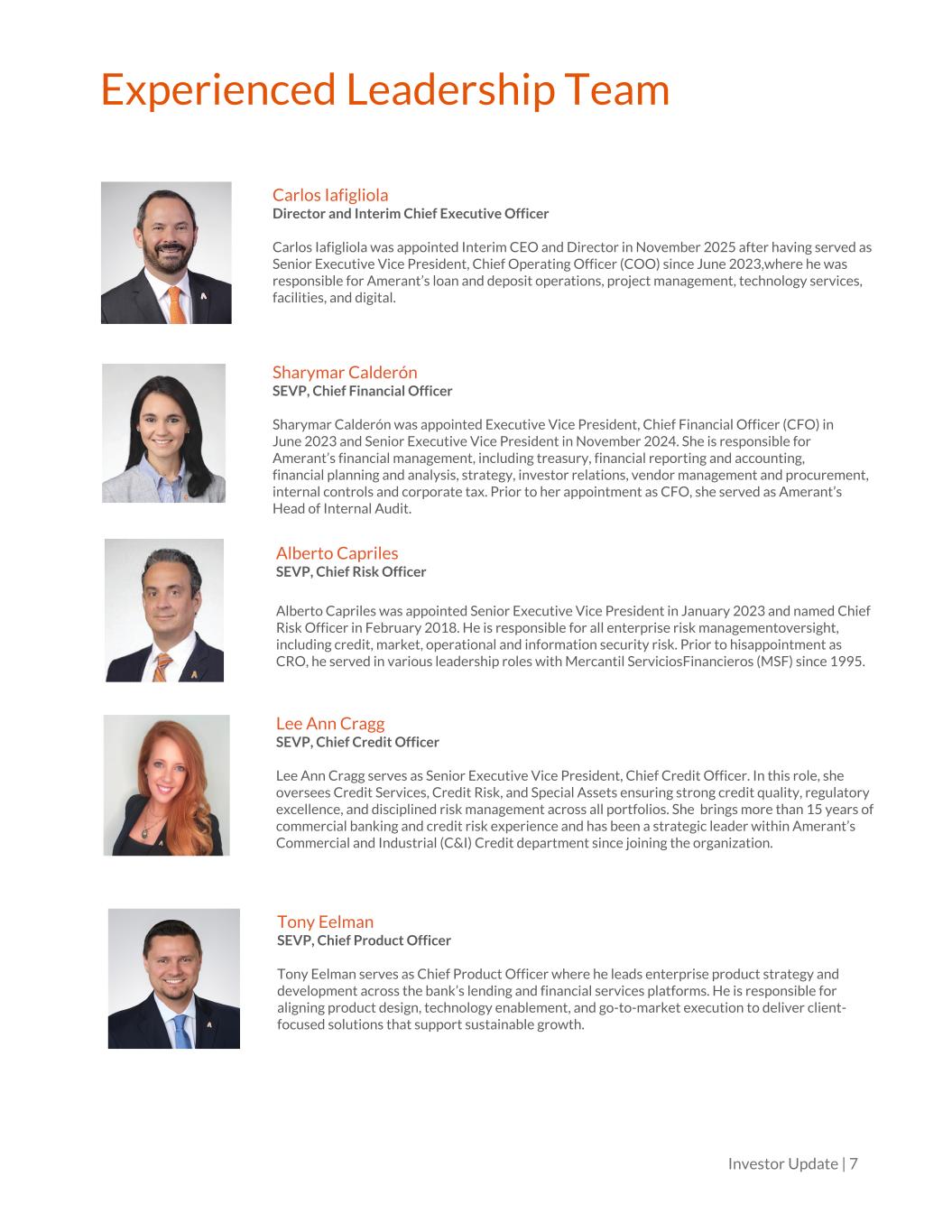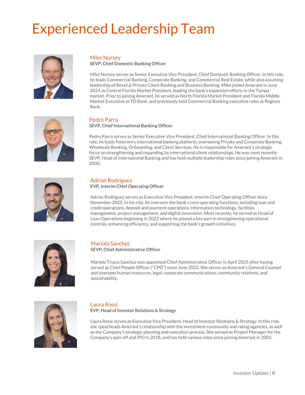 Investor Update | 7 Experienced Leadership Team Carlos Iafigliola Director and Interim Chief Executive Officer Carlos Iafigliola was appointed Interim CEO and Director in November 2025 after having served as Senior Executive Vice President, Chief Operating Officer (COO) since June 2023,where he was responsible for Amerant’s loan and deposit operations, project management, technology services, facilities, and digital. Sharymar Calderón SEVP, Chief Financial Officer Sharymar Calderón was appointed Executive Vice President, Chief Financial Officer (CFO) in June 2023 and Senior Executive Vice President in November 2024. She is responsible for Amerant’s financial management, including treasury, financial reporting and accounting, financial planning and analysis, strategy, investor relations, vendor management and procurement, internal controls and corporate tax. Prior to her appointment as CFO, she served as Amerant’s Head of Internal Audit. Alberto Capriles SEVP, Chief Risk Officer Alberto Capriles was appointed Senior Executive Vice President in January 2023 and named Chief Risk Officer in February 2018. He is responsible for all enterprise risk managementoversight, including credit, market, operational and information security risk. Prior to hisappointment as CRO, he served in various leadership roles with Mercantil ServiciosFinancieros (MSF) since 1995. Lee Ann Cragg SEVP, Chief Credit Officer Lee Ann Cragg serves as Senior Executive Vice President, Chief Credit Officer. In this role, she oversees Credit Services, Credit Risk, and Special Assets ensuring strong credit quality, regulatory excellence, and disciplined risk management across all portfolios. She brings more than 15 years of commercial banking and credit risk experience and has been a strategic leader within Amerant’s Commercial and Industrial (C&I) Credit department since joining the organization. Tony Eelman SEVP, Chief Product Officer Tony Eelman serves as Chief Product Officer where he leads enterprise product strategy and development across the bank’s lending and financial services platforms. He is responsible for aligning product design, technology enablement, and go-to-market execution to deliver client- focused solutions that support sustainable growth.