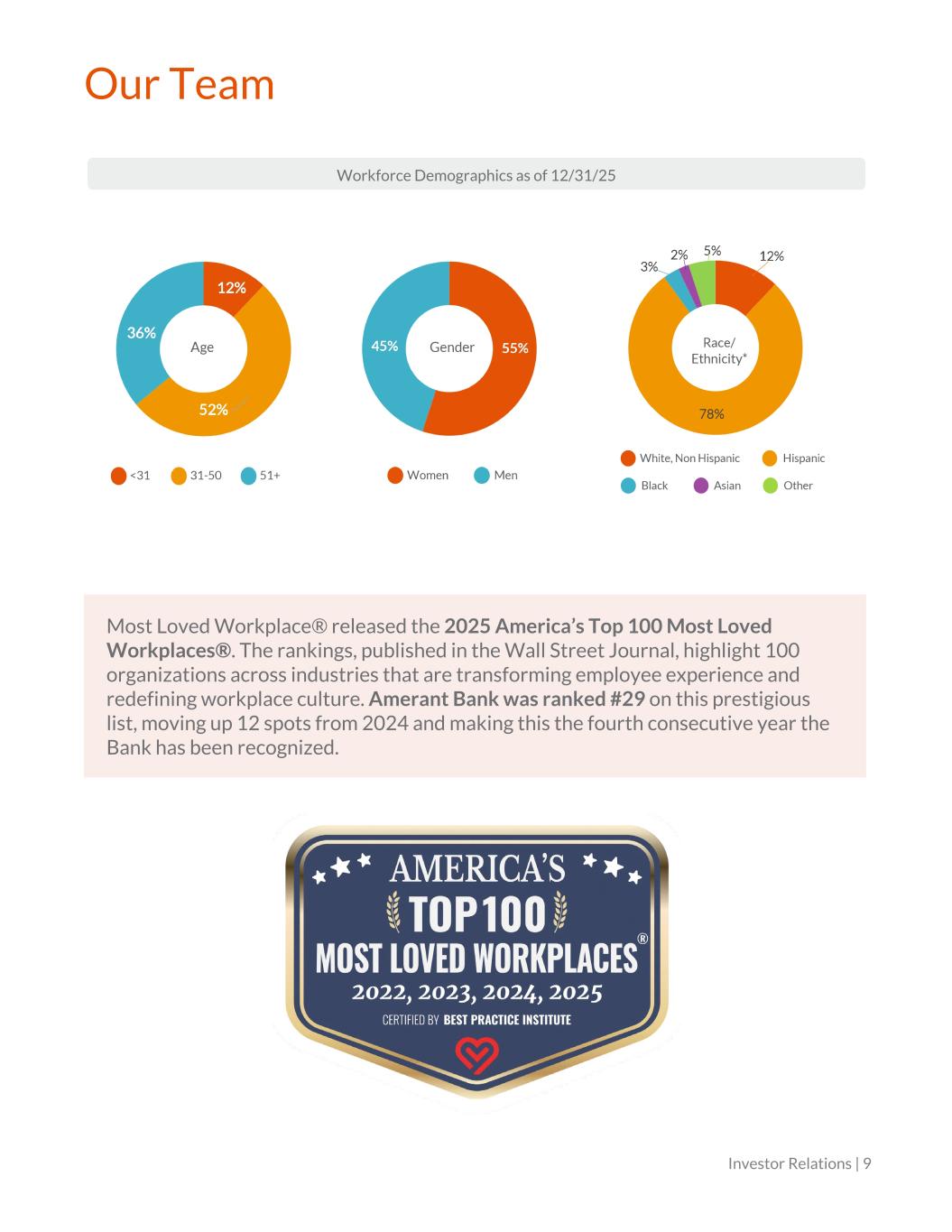 Our Team Most Loved Workplace® released the 2025 America’s Top 100 Most Loved Workplaces®. The rankings, published in the Wall Street Journal, highlight 100 organizations across industries that are transforming employee experience and redefining workplace culture. Amerant Bank was ranked #29 on this prestigious list, moving up 12 spots from 2024 and making this the fourth consecutive year the Bank has been recognized. Workforce Demographics as of 12/31/25 Investor Relations | 9