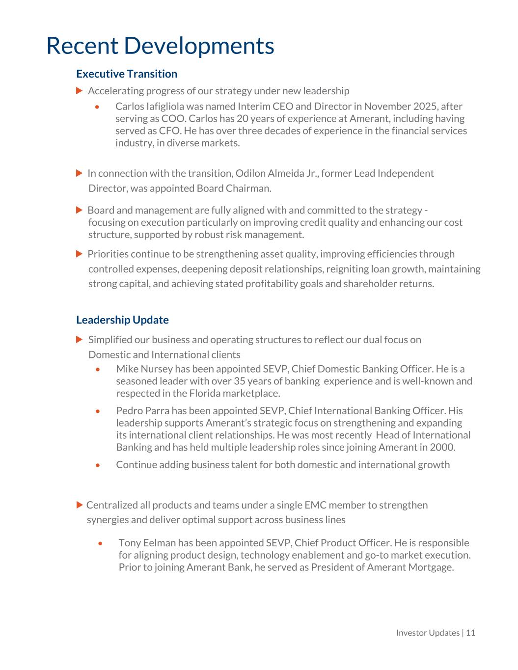 Recent Developments Executive Transition Accelerating progress of our strategy under new leadership In connection with the transition, Odilon Almeida Jr., former Lead Independent Director, was appointed Board Chairman. Board and management are fully aligned with and committed to the strategy - focusing on execution particularly on improving credit quality and enhancing our cost structure, supported by robust risk management. Priorities continue to be strengthening asset quality, improving efficiencies through controlled expenses, deepening deposit relationships, reigniting loan growth, maintaining strong capital, and achieving stated profitability goals and shareholder returns. Leadership Update Simplified our business and operating structures to reflect our dual focus on Domestic and International clients Investor Updates | 11 • Carlos Iafigliola was named Interim CEO and Director in November 2025, after serving as COO. Carlos has 20 years of experience at Amerant, including having served as CFO. He has over three decades of experience in the financial services industry, in diverse markets. • Tony Eelman has been appointed SEVP, Chief Product Officer. He is responsible for aligning product design, technology enablement and go-to market execution. Prior to joining Amerant Bank, he served as President of Amerant Mortgage. • Mike Nursey has been appointed SEVP, Chief Domestic Banking Officer. He is a seasoned leader with over 35 years of banking experience and is well-known and respected in the Florida marketplace. • Pedro Parra has been appointed SEVP, Chief International Banking Officer. His leadership supports Amerant’s strategic focus on strengthening and expanding its international client relationships. He was most recently Head of International Banking and has held multiple leadership roles since joining Amerant in 2000. • Continue adding business talent for both domestic and international growth Centralized all products and teams under a single EMC member to strengthen synergies and deliver optimal support across business lines