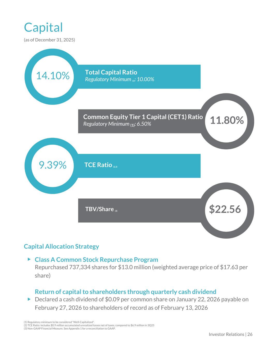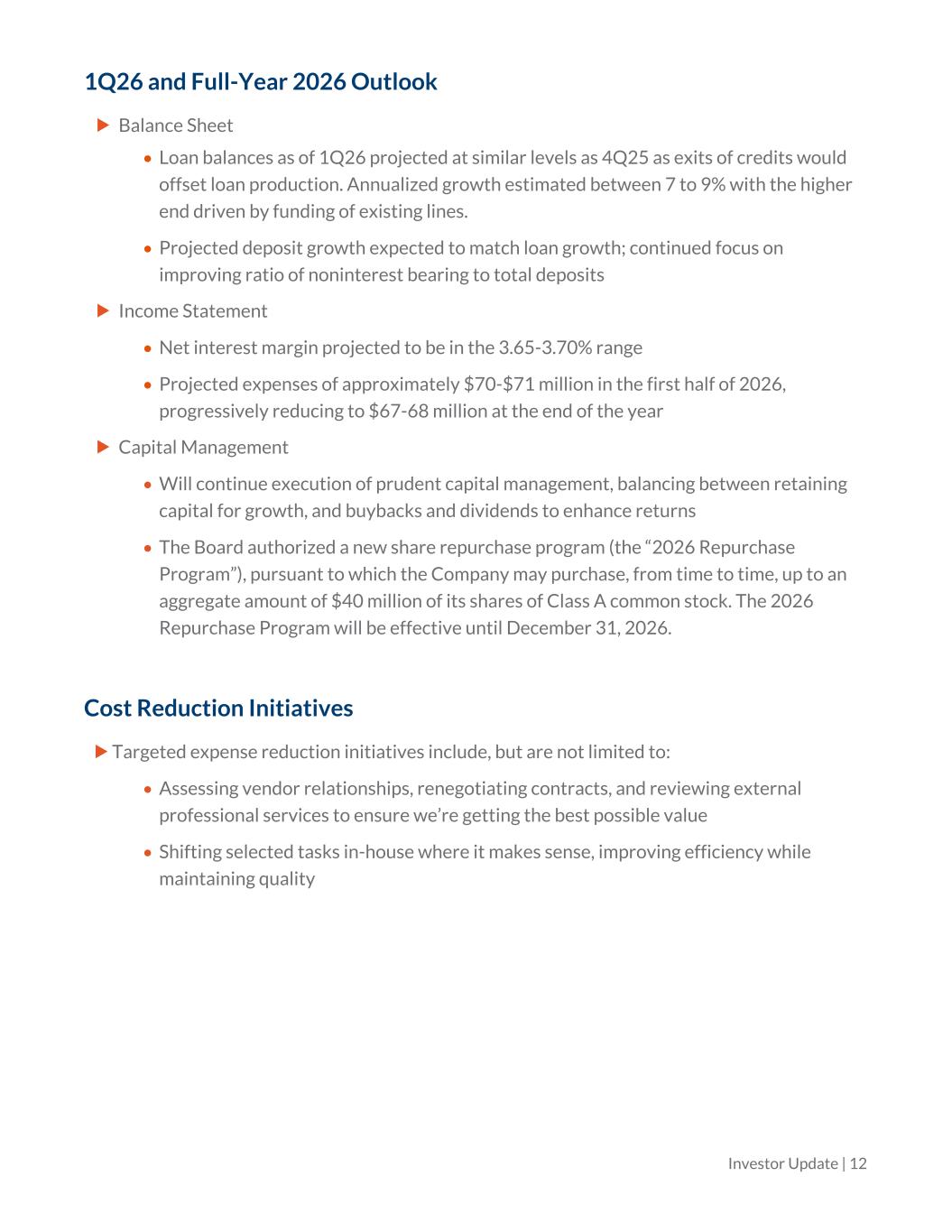 1Q26 and Full-Year 2026 Outlook Balance Sheet • Loan balances as of 1Q26 projected at similar levels as 4Q25 as exits of credits would offset loan production. Annualized growth estimated between 7 to 9% with the higher end driven by funding of existing lines. • Projected deposit growth expected to match loan growth; continued focus on improving ratio of noninterest bearing to total deposits Income Statement • Net interest margin projected to be in the 3.65-3.70% range • Projected expenses of approximately $70-$71 million in the first half of 2026, progressively reducing to $67-68 million at the end of the year Capital Management • Will continue execution of prudent capital management, balancing between retaining capital for growth, and buybacks and dividends to enhance returns • The Board authorized a new share repurchase program (the “2026 Repurchase Program”), pursuant to which the Company may purchase, from time to time, up to an aggregate amount of $40 million of its shares of Class A common stock. The 2026 Repurchase Program will be effective until December 31, 2026. Cost Reduction Initiatives Targeted expense reduction initiatives include, but are not limited to: • Assessing vendor relationships, renegotiating contracts, and reviewing external professional services to ensure we’re getting the best possible value • Shifting selected tasks in-house where it makes sense, improving efficiency while maintaining quality Investor Update | 12