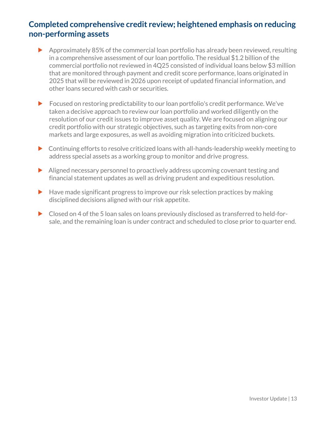Completed comprehensive credit review; heightened emphasis on reducing non-performing assets Approximately 85% of the commercial loan portfolio has already been reviewed, resulting in a comprehensive assessment of our loan portfolio. The residual $1.2 billion of the commercial portfolio not reviewed in 4Q25 consisted of individual loans below $3 million that are monitored through payment and credit score performance, loans originated in 2025 that will be reviewed in 2026 upon receipt of updated financial information, and other loans secured with cash or securities. Focused on restoring predictability to our loan portfolio's credit performance. We've taken a decisive approach to review our loan portfolio and worked diligently on the resolution of our credit issues to improve asset quality. We are focused on aligning our credit portfolio with our strategic objectives, such as targeting exits from non-core markets and large exposures, as well as avoiding migration into criticized buckets. Continuing efforts to resolve criticized loans with all-hands-leadership weekly meeting to address special assets as a working group to monitor and drive progress. Aligned necessary personnel to proactively address upcoming covenant testing and financial statement updates as well as driving prudent and expeditious resolution. Have made significant progress to improve our risk selection practices by making disciplined decisions aligned with our risk appetite. Closed on 4 of the 5 loan sales on loans previously disclosed as transferred to held-for- sale, and the remaining loan is under contract and scheduled to close prior to quarter end. Investor Update | 13