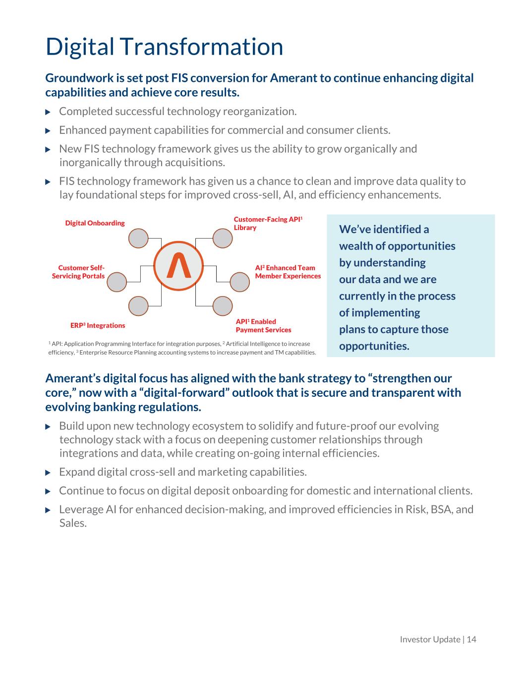 Digital Transformation Groundwork is set post FIS conversion for Amerant to continue enhancing digital capabilities and achieve core results. Completed successful technology reorganization. Enhanced payment capabilities for commercial and consumer clients. New FIS technology framework gives us the ability to grow organically and inorganically through acquisitions. FIS technology framework has given us a chance to clean and improve data quality to lay foundational steps for improved cross-sell, AI, and efficiency enhancements. 1 API: Application Programming Interface for integration purposes, 2 Artificial Intelligence to increase efficiency, 3 Enterprise Resource Planning accounting systems to increase payment and TM capabilities. We’ve identified a wealth of opportunities by understanding our data and we are currently in the process of implementing plans to capture those opportunities. Amerant’s digital focus has aligned with the bank strategy to “strengthen our core,” now with a “digital-forward” outlook that is secure and transparent with evolving banking regulations. Build upon new technology ecosystem to solidify and future-proof our evolving technology stack with a focus on deepening customer relationships through integrations and data, while creating on-going internal efficiencies. Expand digital cross-sell and marketing capabilities. Continue to focus on digital deposit onboarding for domestic and international clients. Leverage AI for enhanced decision-making, and improved efficiencies in Risk, BSA, and Sales. Investor Update | 14