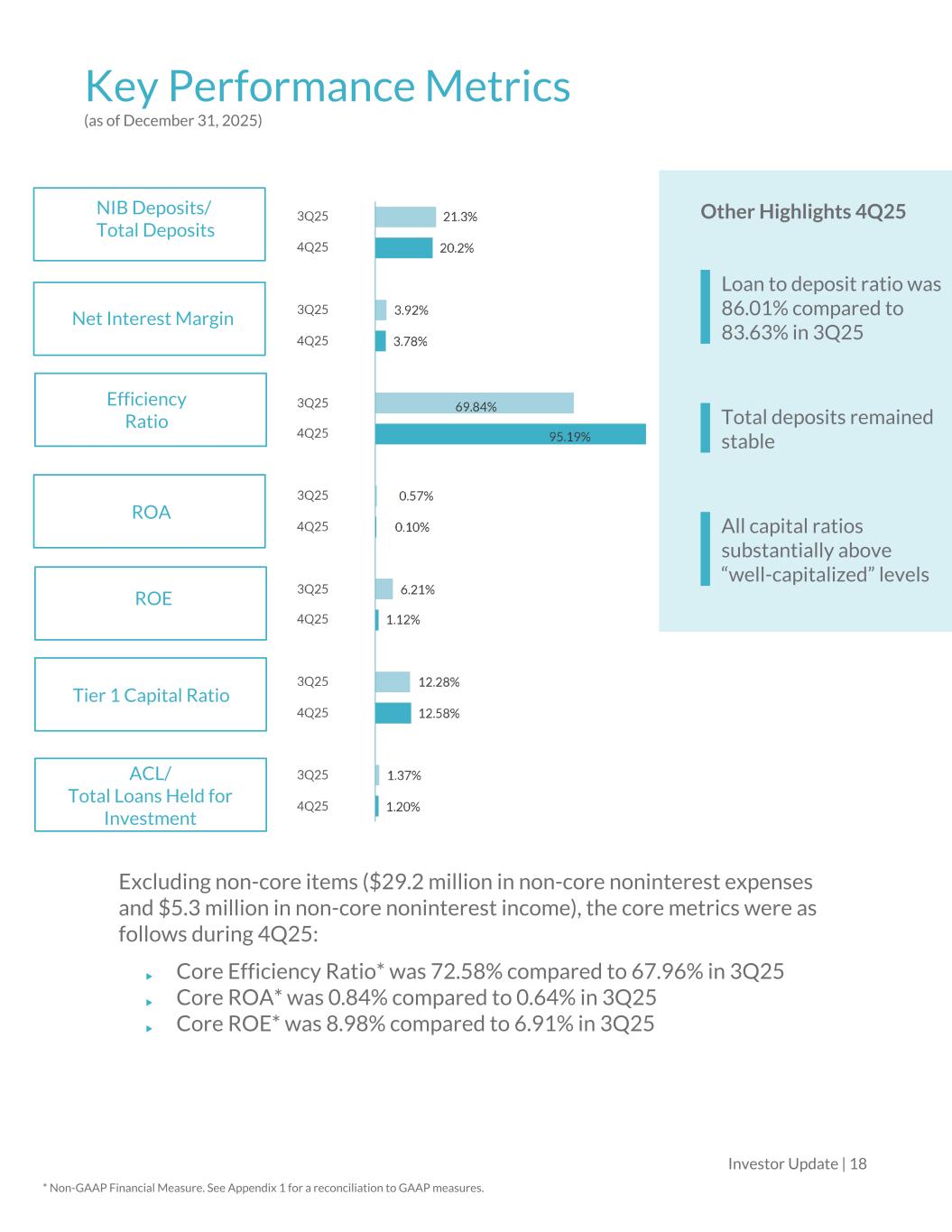 Key Performance Metrics (as of December 31, 2025) Other Highlights 4Q25 Loan to deposit ratio was 86.01% compared to 83.63% in 3Q25 Total deposits remained stable All capital ratios substantially above “well-capitalized” levels Investor Update | 18 Excluding non-core items ($29.2 million in non-core noninterest expenses and $5.3 million in non-core noninterest income), the core metrics were as follows during 4Q25: Core Efficiency Ratio* was 72.58% compared to 67.96% in 3Q25 Core ROA* was 0.84% compared to 0.64% in 3Q25 Core ROE* was 8.98% compared to 6.91% in 3Q25 * Non-GAAP Financial Measure. See Appendix 1 for a reconciliation to GAAP measures. NIB Deposits/ Total Deposits Net Interest Margin Efficiency Ratio ROA ROE Tier 1 Capital Ratio ACL/ Total Loans Held for Investment
