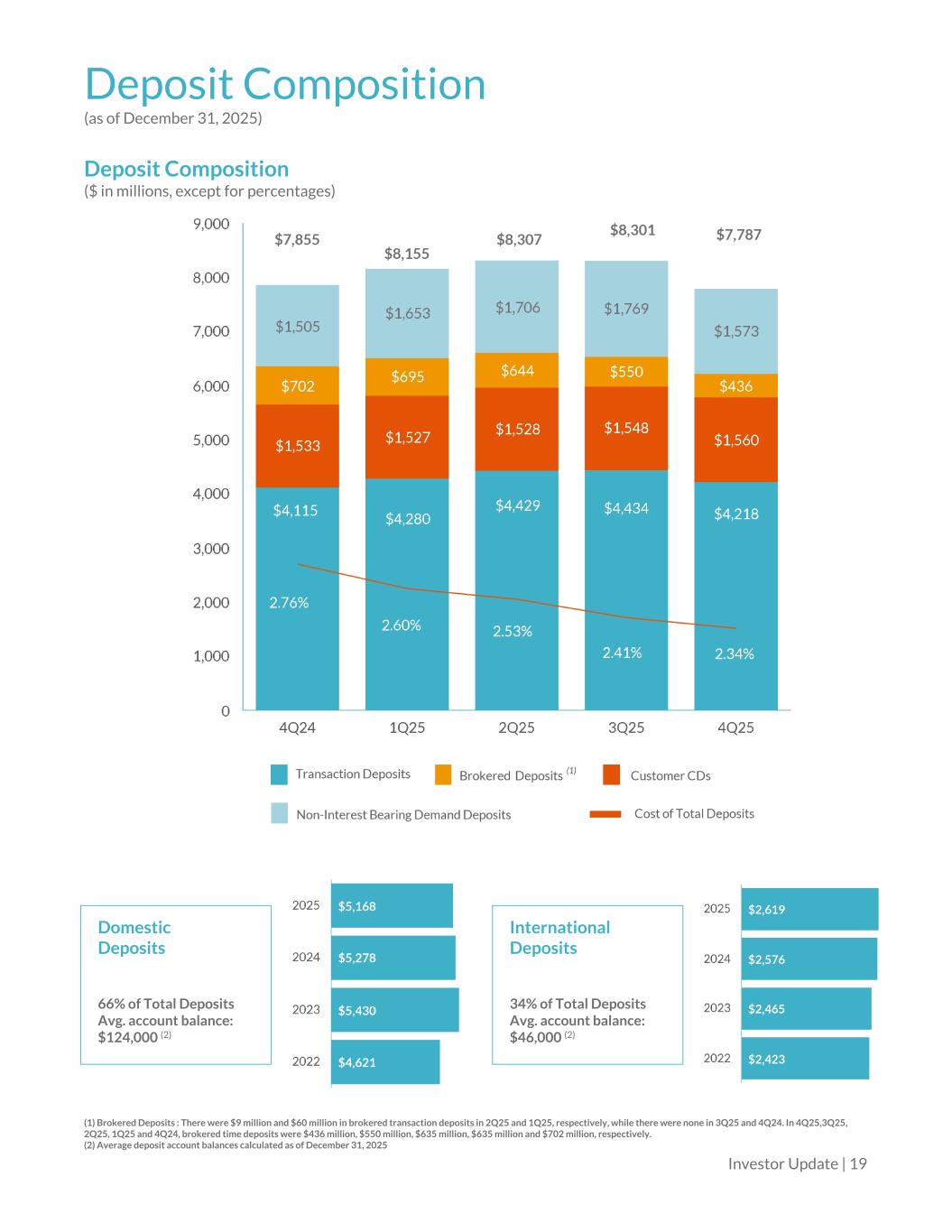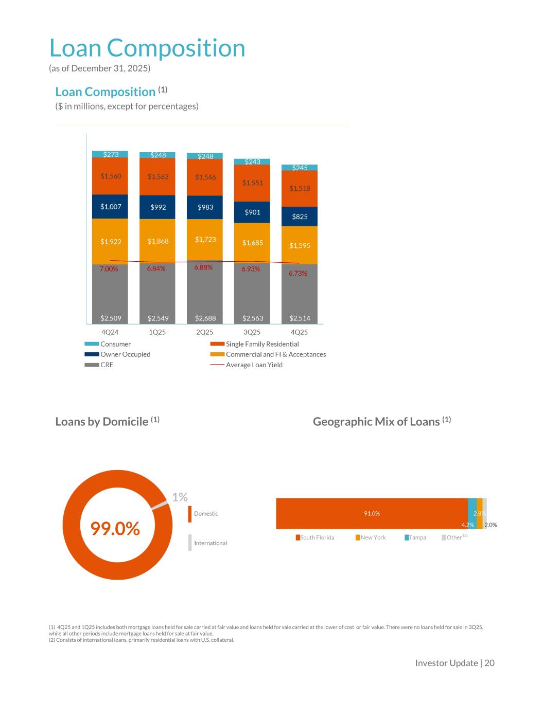 Deposit Composition (as of December 31, 2025) Deposit Composition ($ in millions, except for percentages) Domestic Deposits 66% of Total Deposits Avg. account balance: $124,000 (2) International Deposits 34% of Total Deposits Avg. account balance: $46,000 (2) (1) Brokered Deposits : There were $9 million and $60 million in brokered transaction deposits in 2Q25 and 1Q25, respectively, while there were none in 3Q25 and 4Q24. In 4Q25,3Q25, 2Q25, 1Q25 and 4Q24, brokered time deposits were $436 million, $550 million, $635 million, $635 million and $702 million, respectively. (2) Average deposit account balances calculated as of December 31, 2025 Investor Update | 19