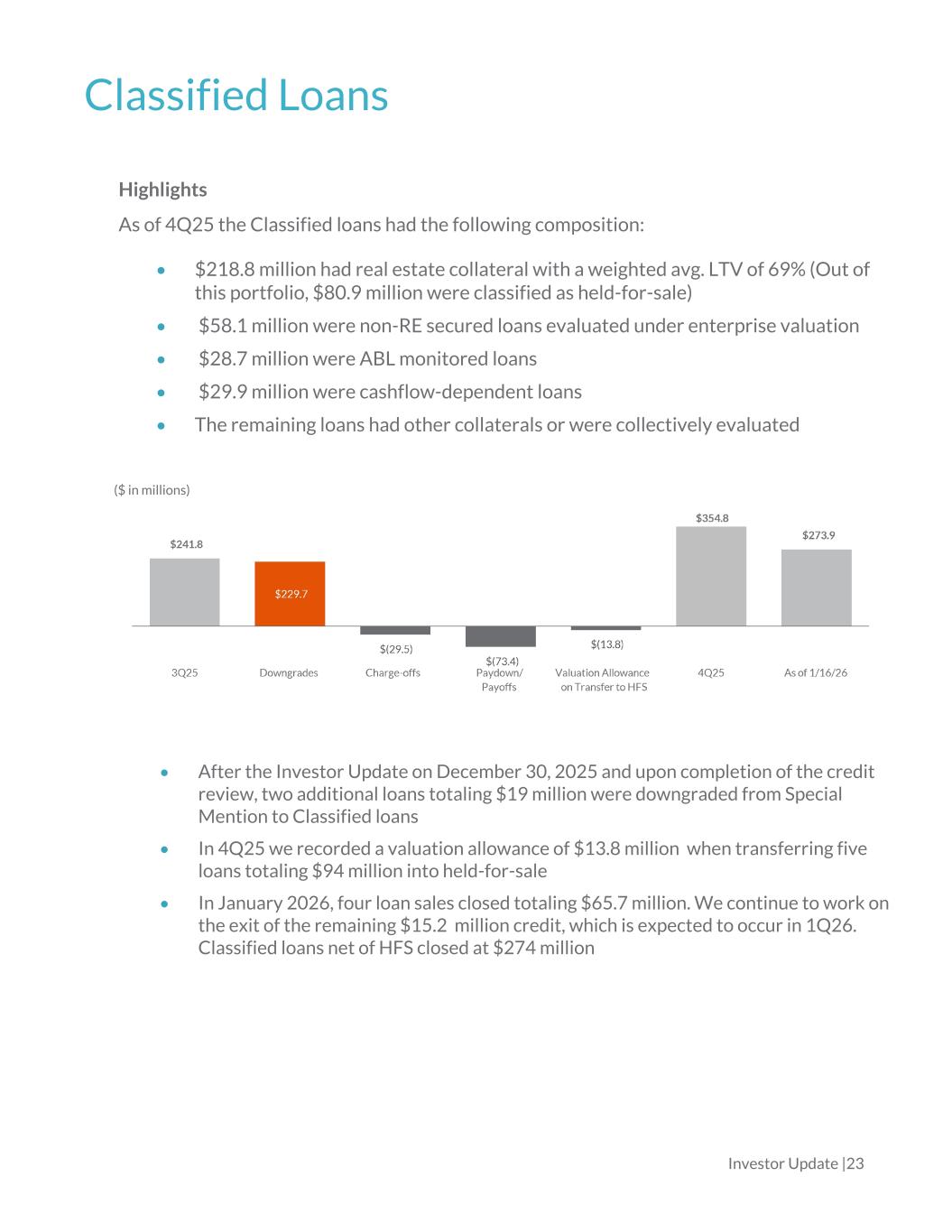 Non-Performing Loans Investor Update | 22 Highlights As of 4Q25 the NPLs had the following composition: • $78.3 million had real estate collateral with a weighted avg. LTV of 77% (Out of this portfolio, $16.2 million was classified as held-for-sale) • $39.5 million were non-RE secured loans evaluated under enterprise valuation • $27.1 million were cashflow-dependent loans • $9.5 million were ABL monitored loans • The remaining loans had other collaterals or were collectively evaluated • After the Investor Update on December 30, 2025 and upon completion of the credit review, three additional Classified loans totaling $17 million were placed in non-accrual status • In 4Q25 we recorded a valuation allowance of $3.6 million when transferring a $20 million loan into held-for-sale • In January 2026, the loan sale was completed reducing NPLs to $155.2 million ($ in millions)