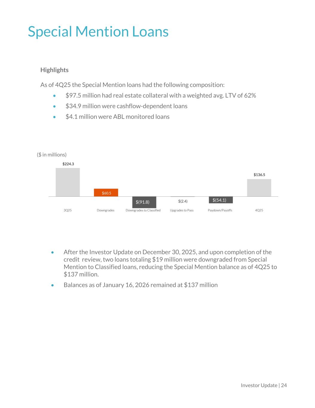 Special Mention Loans Investor Update | 24 Highlights As of 4Q25 the Special Mention loans had the following composition: • $97.5 million had real estate collateral with a weighted avg. LTV of 62% • $34.9 million were cashflow-dependent loans • $4.1 million were ABL monitored loans ($ in millions) • After the Investor Update on December 30, 2025, and upon completion of the credit review, two loans totaling $19 million were downgraded from Special Mention to Classified loans, reducing the Special Mention balance as of 4Q25 to $137 million. • Balances as of January 16, 2026 remained at $137 million $(91.8) $(54.1)