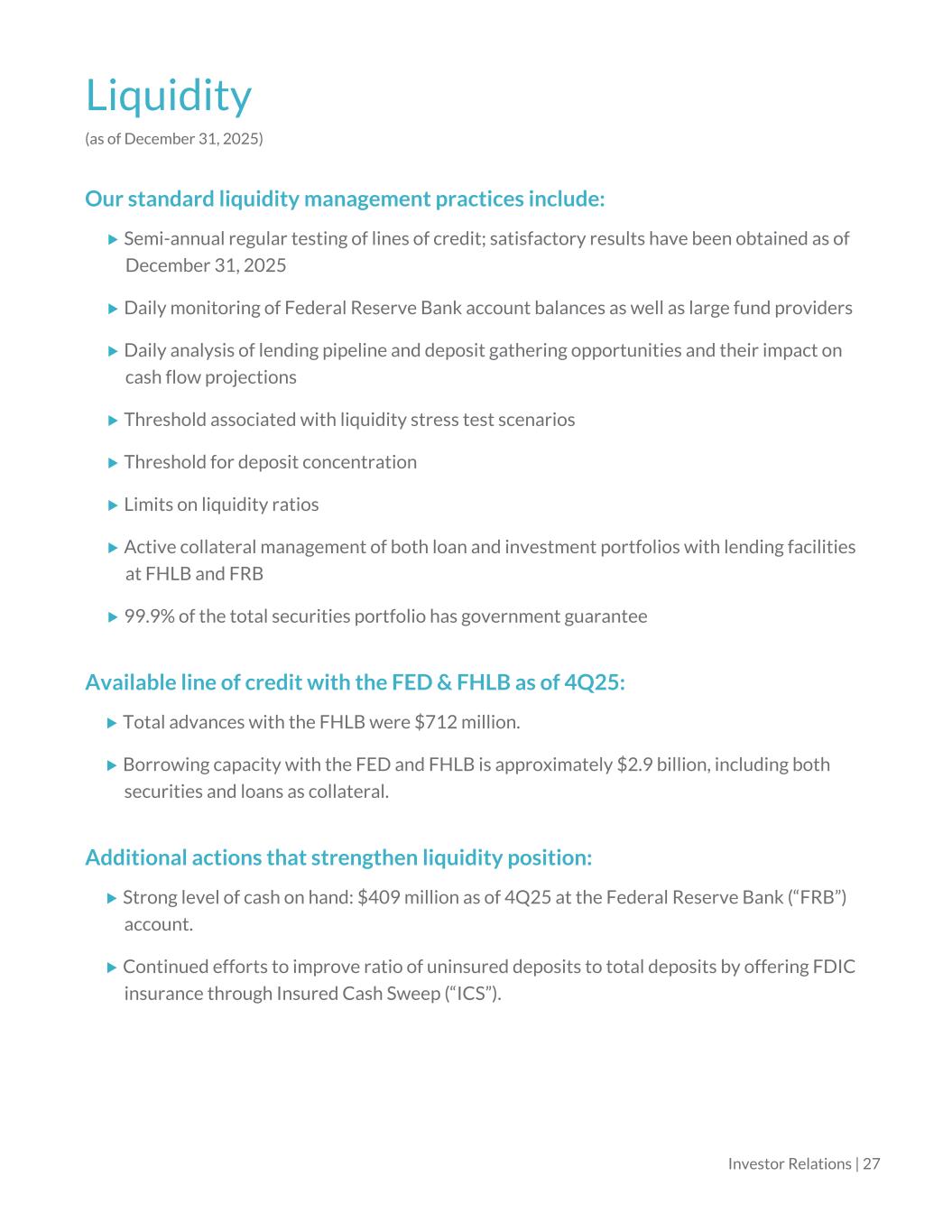 Liquidity (as of December 31, 2025) Our standard liquidity management practices include: Semi-annual regular testing of lines of credit; satisfactory results have been obtained as of December 31, 2025 Daily monitoring of Federal Reserve Bank account balances as well as large fund providers Daily analysis of lending pipeline and deposit gathering opportunities and their impact on cash flow projections Threshold associated with liquidity stress test scenarios Threshold for deposit concentration Limits on liquidity ratios Active collateral management of both loan and investment portfolios with lending facilities at FHLB and FRB 99.9% of the total securities portfolio has government guarantee Available line of credit with the FED & FHLB as of 4Q25: Total advances with the FHLB were $712 million. Borrowing capacity with the FED and FHLB is approximately $2.9 billion, including both securities and loans as collateral. Additional actions that strengthen liquidity position: Strong level of cash on hand: $409 million as of 4Q25 at the Federal Reserve Bank (“FRB”) account. Continued efforts to improve ratio of uninsured deposits to total deposits by offering FDIC insurance through Insured Cash Sweep (“ICS”). Investor Relations | 27