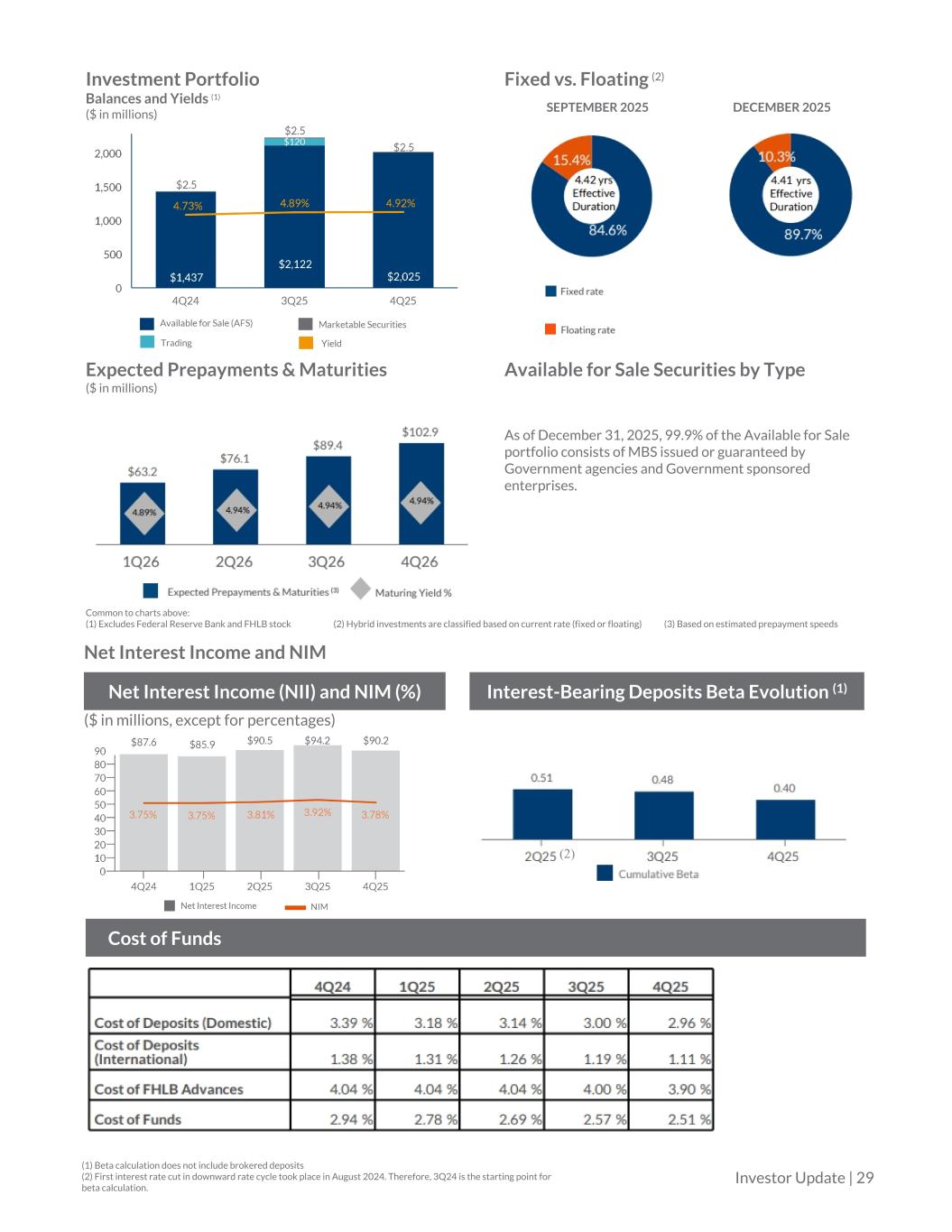 Investment Portfolio Balances and Yields (1) ($ in millions) Fixed vs. Floating (2) SEPTEMBER 2025 DECEMBER 2025 Expected Prepayments & Maturities ($ in millions) Available for Sale Securities by Type As of December 31, 2025, 99.9% of the Available for Sale portfolio consists of MBS issued or guaranteed by Government agencies and Government sponsored enterprises. Common to charts above: (1) Excludes Federal Reserve Bank and FHLB stock (2) Hybrid investments are classified based on current rate (fixed or floating) (3) Based on estimated prepayment speeds Net Interest Income and NIM Net Interest Income (NII) and NIM (%) Interest-Bearing Deposits Beta Evolution (1) ($ in millions, except for percentages) Cost of Funds (1) Beta calculation does not include brokered deposits (2) First interest rate cut in downward rate cycle took place in August 2024. Therefore, 3Q24 is the starting point for beta calculation. ances Cost of Funds Investor Update | 29 (2)