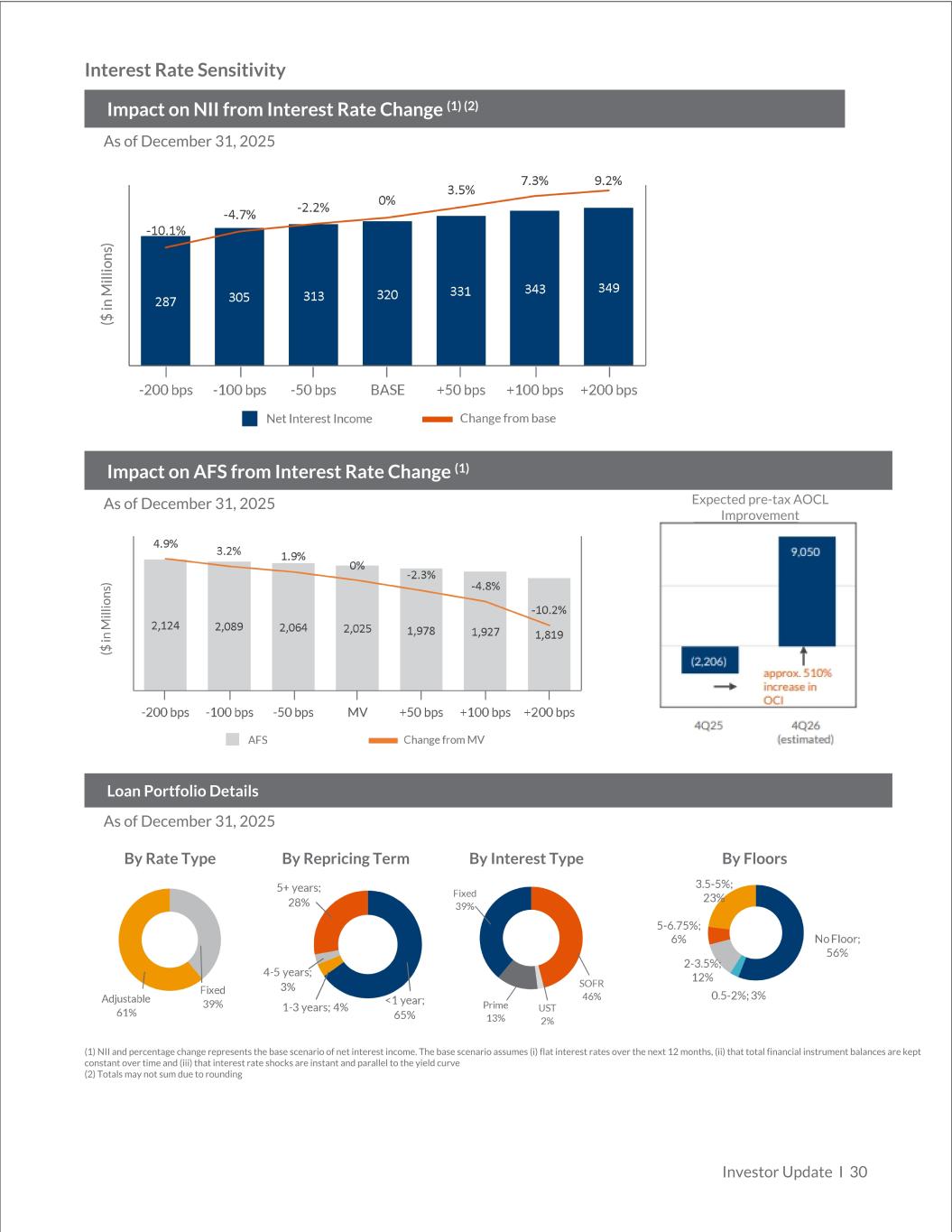 Interest Rate Sensitivity Impact on NII from Interest Rate Change (1) (2) As of December 31, 2025 Impact on AFS from Interest Rate Change (1) As of December 31, 2025 Loan Portfolio Details As of December 31, 2025 By Rate Type By Repricing Term By Interest Type By Floors (1) NII and percentage change represents the base scenario of net interest income. The base scenario assumes (i) flat interest rates over the next 12 months, (ii) that total financial instrument balances are kept constant over time and (iii) that interest rate shocks are instant and parallel to the yield curve (2) Totals may not sum due to rounding Investor Update I 30 Expected pre-tax AOCL Improvement