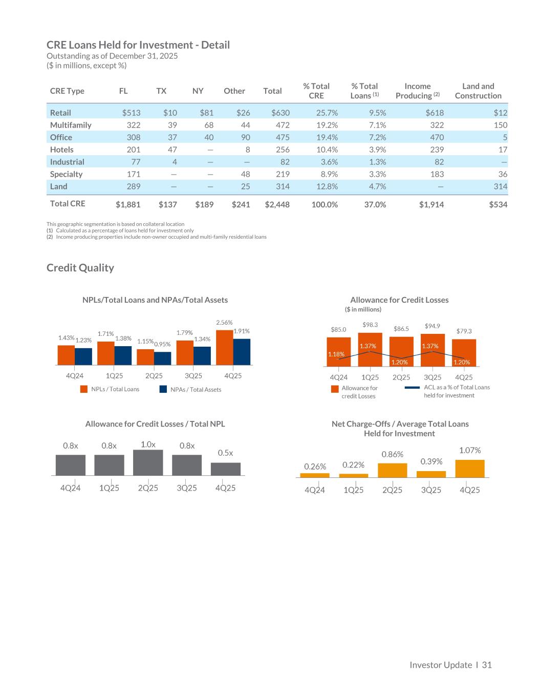 CRE Loans Held for Investment - Detail Outstanding as of December 31, 2025 ($ in millions, except %) CRE Type FL TX NY Other Total % Total CRE % Total Loans (1) Income Producing (2) Land and Construction Retail $513 $10 $81 $26 $630 25.7% 9.5% $618 $12 Multifamily 322 39 68 44 472 19.2% 7.1% 322 150 Office 308 37 40 90 475 19.4% 7.2% 470 5 Hotels 201 47 — 8 256 10.4% 3.9% 239 17 Industrial 77 4 — — 82 3.6% 1.3% 82 — Specialty 171 — — 48 219 8.9% 3.3% 183 36 Land 289 — — 25 314 12.8% 4.7% — 314 Total CRE $1,881 $137 $189 $241 $2,448 100.0% 37.0% $1,914 $534 This geographic segmentation is based on collateral location (1) Calculated as a percentage of loans held for investment only (2) Income producing properties include non-owner occupied and multi-family residential loans Credit Quality Allowance for Credit LossesNPLs/Total Loans and NPAs/Total Assets ($ in millions) Allowance for Credit Losses / Total NPL Net Charge-Offs / Average Total Loans Held for Investment Investor Update I 31
