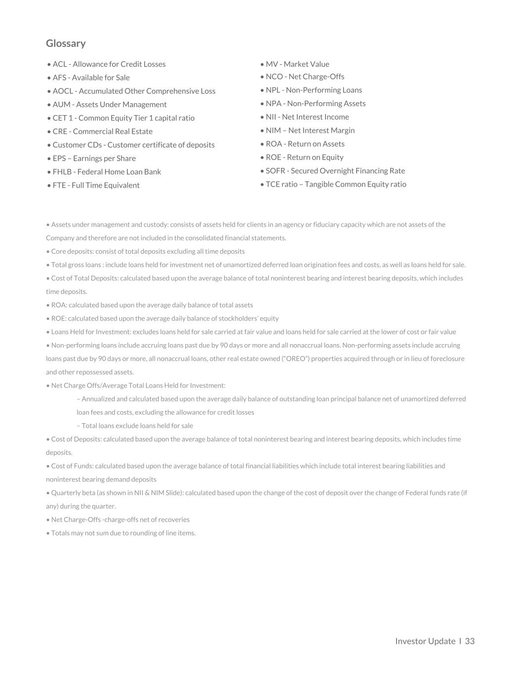 Glossary • ACL - Allowance for Credit Losses • MV - Market Value • AFS - Available for Sale • NCO - Net Charge-Offs • AOCL - Accumulated Other Comprehensive Loss • NPL - Non-Performing Loans • AUM - Assets Under Management • NPA - Non-Performing Assets • CET 1 - Common Equity Tier 1 capital ratio • NII - Net Interest Income • CRE - Commercial Real Estate • NIM – Net Interest Margin • Customer CDs - Customer certificate of deposits • ROA - Return on Assets • EPS – Earnings per Share • ROE - Return on Equity • FHLB - Federal Home Loan Bank • SOFR - Secured Overnight Financing Rate • FTE - Full Time Equivalent • TCE ratio – Tangible Common Equity ratio • Assets under management and custody: consists of assets held for clients in an agency or fiduciary capacity which are not assets of the Company and therefore are not included in the consolidated financial statements. • Core deposits: consist of total deposits excluding all time deposits • Total gross loans : include loans held for investment net of unamortized deferred loan origination fees and costs, as well as loans held for sale. • Cost of Total Deposits: calculated based upon the average balance of total noninterest bearing and interest bearing deposits, which includes time deposits. • ROA: calculated based upon the average daily balance of total assets • ROE: calculated based upon the average daily balance of stockholders’ equity • Loans Held for Investment: excludes loans held for sale carried at fair value and loans held for sale carried at the lower of cost or fair value • Non-performing loans include accruing loans past due by 90 days or more and all nonaccrual loans. Non-performing assets include accruing loans past due by 90 days or more, all nonaccrual loans, other real estate owned (“OREO”) properties acquired through or in lieu of foreclosure and other repossessed assets. • Net Charge Offs/Average Total Loans Held for Investment: – Annualized and calculated based upon the average daily balance of outstanding loan principal balance net of unamortized deferred loan fees and costs, excluding the allowance for credit losses – Total loans exclude loans held for sale • Cost of Deposits: calculated based upon the average balance of total noninterest bearing and interest bearing deposits, which includes time deposits. • Cost of Funds: calculated based upon the average balance of total financial liabilities which include total interest bearing liabilities and noninterest bearing demand deposits • Quarterly beta (as shown in NII & NIM Slide): calculated based upon the change of the cost of deposit over the change of Federal funds rate (if any) during the quarter. • Net Charge-Offs -charge-offs net of recoveries • Totals may not sum due to rounding of line items. Investor Update I 33