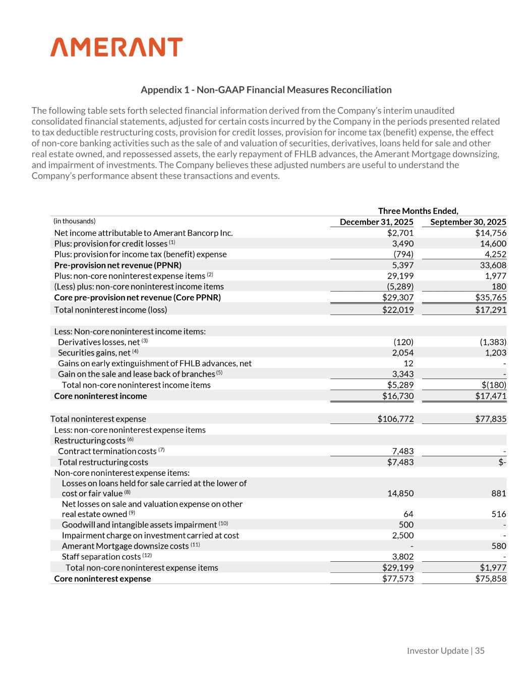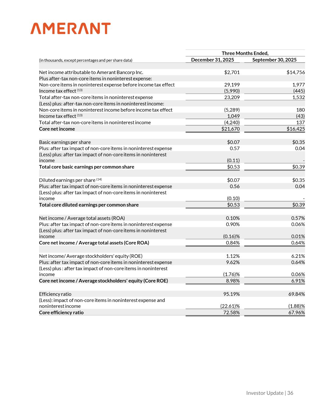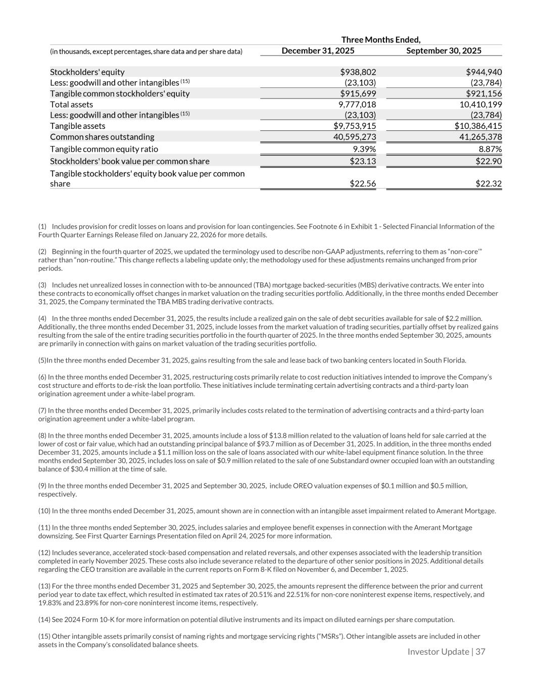 Investor Update | 37 (1) Includes provision for credit losses on loans and provision for loan contingencies. See Footnote 6 in Exhibit 1 - Selected Financial Information of the Fourth Quarter Earnings Release filed on January 22, 2026 for more details. (2) Beginning in the fourth quarter of 2025, we updated the terminology used to describe non-GAAP adjustments, referring to them as “non-core’” rather than “non-routine.” This change reflects a labeling update only; the methodology used for these adjustments remains unchanged from prior periods. (3) Includes net unrealized losses in connection with to-be announced (TBA) mortgage backed-securities (MBS) derivative contracts. We enter into these contracts to economically offset changes in market valuation on the trading securities portfolio. Additionally, in the three months ended December 31, 2025, the Company terminated the TBA MBS trading derivative contracts. (4) In the three months ended December 31, 2025, the results include a realized gain on the sale of debt securities available for sale of $2.2 million. Additionally, the three months ended December 31, 2025, include losses from the market valuation of trading securities, partially offset by realized gains resulting from the sale of the entire trading securities portfolio in the fourth quarter of 2025. In the three months ended September 30, 2025, amounts are primarily in connection with gains on market valuation of the trading securities portfolio. (5)In the three months ended December 31, 2025, gains resulting from the sale and lease back of two banking centers located in South Florida. (6) In the three months ended December 31, 2025, restructuring costs primarily relate to cost reduction initiatives intended to improve the Company’s cost structure and efforts to de-risk the loan portfolio. These initiatives include terminating certain advertising contracts and a third-party loan origination agreement under a white-label program. (7) In the three months ended December 31, 2025, primarily includes costs related to the termination of advertising contracts and a third-party loan origination agreement under a white-label program. (8) In the three months ended December 31, 2025, amounts include a loss of $13.8 million related to the valuation of loans held for sale carried at the lower of cost or fair value, which had an outstanding principal balance of $93.7 million as of December 31, 2025. In addition, in the three months ended December 31, 2025, amounts include a $1.1 million loss on the sale of loans associated with our white-label equipment finance solution. In the three months ended September 30, 2025, includes loss on sale of $0.9 million related to the sale of one Substandard owner occupied loan with an outstanding balance of $30.4 million at the time of sale. (9) In the three months ended December 31, 2025 and September 30, 2025, include OREO valuation expenses of $0.1 million and $0.5 million, respectively. (10) In the three months ended December 31, 2025, amount shown are in connection with an intangible asset impairment related to Amerant Mortgage. (11) In the three months ended September 30, 2025, includes salaries and employee benefit expenses in connection with the Amerant Mortgage downsizing. See First Quarter Earnings Presentation filed on April 24, 2025 for more information. (12) Includes severance, accelerated stock-based compensation and related reversals, and other expenses associated with the leadership transition completed in early November 2025. These costs also include severance related to the departure of other senior positions in 2025. Additional details regarding the CEO transition are available in the current reports on Form 8-K filed on November 6, and December 1, 2025. (13) For the three months ended December 31, 2025 and September 30, 2025, the amounts represent the difference between the prior and current period year to date tax effect, which resulted in estimated tax rates of 20.51% and 22.51% for non-core noninterest expense items, respectively, and 19.83% and 23.89% for non-core noninterest income items, respectively. (14) See 2024 Form 10-K for more information on potential dilutive instruments and its impact on diluted earnings per share computation. (15) Other intangible assets primarily consist of naming rights and mortgage servicing rights (“MSRs”). Other intangible assets are included in other assets in the Company’s consolidated balance sheets.