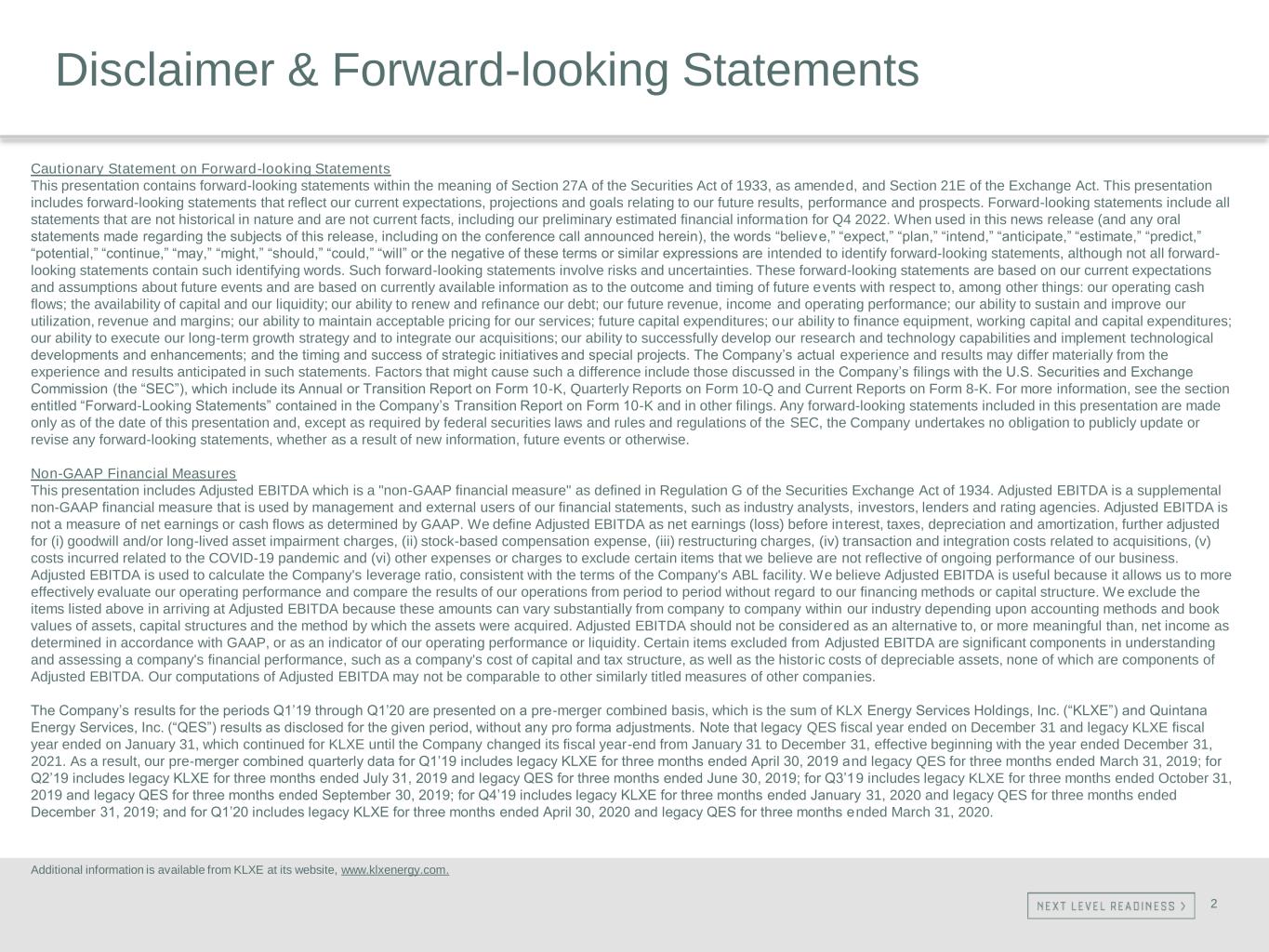 2 Disclaimer & Forward-looking Statements Cautionary Statement on Forward-looking Statements This presentation contains forward-looking statements within the meaning of Section 27A of the Securities Act of 1933, as amended, and Section 21E of the Exchange Act. This presentation includes forward-looking statements that reflect our current expectations, projections and goals relating to our future results, performance and prospects. Forward-looking statements include all statements that are not historical in nature and are not current facts, including our preliminary estimated financial information for Q4 2022. When used in this news release (and any oral statements made regarding the subjects of this release, including on the conference call announced herein), the words “believe,” “expect,” “plan,” “intend,” “anticipate,” “estimate,” “predict,” “potential,” “continue,” “may,” “might,” “should,” “could,” “will” or the negative of these terms or similar expressions are intended to identify forward-looking statements, although not all forward- looking statements contain such identifying words. Such forward-looking statements involve risks and uncertainties. These forward-looking statements are based on our current expectations and assumptions about future events and are based on currently available information as to the outcome and timing of future events with respect to, among other things: our operating cash flows; the availability of capital and our liquidity; our ability to renew and refinance our debt; our future revenue, income and operating performance; our ability to sustain and improve our utilization, revenue and margins; our ability to maintain acceptable pricing for our services; future capital expenditures; our ability to finance equipment, working capital and capital expenditures; our ability to execute our long-term growth strategy and to integrate our acquisitions; our ability to successfully develop our research and technology capabilities and implement technological developments and enhancements; and the timing and success of strategic initiatives and special projects. The Company’s actual experience and results may differ materially from the experience and results anticipated in such statements. Factors that might cause such a difference include those discussed in the Company’s filings with the U.S. Securities and Exchange Commission (the “SEC”), which include its Annual or Transition Report on Form 10-K, Quarterly Reports on Form 10-Q and Current Reports on Form 8-K. For more information, see the section entitled “Forward-Looking Statements” contained in the Company’s Transition Report on Form 10-K and in other filings. Any forward-looking statements included in this presentation are made only as of the date of this presentation and, except as required by federal securities laws and rules and regulations of the SEC, the Company undertakes no obligation to publicly update or revise any forward-looking statements, whether as a result of new information, future events or otherwise. Non-GAAP Financial Measures This presentation includes Adjusted EBITDA which is a "non-GAAP financial measure" as defined in Regulation G of the Securities Exchange Act of 1934. Adjusted EBITDA is a supplemental non-GAAP financial measure that is used by management and external users of our financial statements, such as industry analysts, investors, lenders and rating agencies. Adjusted EBITDA is not a measure of net earnings or cash flows as determined by GAAP. We define Adjusted EBITDA as net earnings (loss) before interest, taxes, depreciation and amortization, further adjusted for (i) goodwill and/or long-lived asset impairment charges, (ii) stock-based compensation expense, (iii) restructuring charges, (iv) transaction and integration costs related to acquisitions, (v) costs incurred related to the COVID-19 pandemic and (vi) other expenses or charges to exclude certain items that we believe are not reflective of ongoing performance of our business. Adjusted EBITDA is used to calculate the Company's leverage ratio, consistent with the terms of the Company's ABL facility. We believe Adjusted EBITDA is useful because it allows us to more effectively evaluate our operating performance and compare the results of our operations from period to period without regard to our financing methods or capital structure. We exclude the items listed above in arriving at Adjusted EBITDA because these amounts can vary substantially from company to company within our industry depending upon accounting methods and book values of assets, capital structures and the method by which the assets were acquired. Adjusted EBITDA should not be considered as an alternative to, or more meaningful than, net income as determined in accordance with GAAP, or as an indicator of our operating performance or liquidity. Certain items excluded from Adjusted EBITDA are significant components in understanding and assessing a company's financial performance, such as a company's cost of capital and tax structure, as well as the historic costs of depreciable assets, none of which are components of Adjusted EBITDA. Our computations of Adjusted EBITDA may not be comparable to other similarly titled measures of other companies. The Company’s results for the periods Q1’19 through Q1’20 are presented on a pre-merger combined basis, which is the sum of KLX Energy Services Holdings, Inc. (“KLXE”) and Quintana Energy Services, Inc. (“QES”) results as disclosed for the given period, without any pro forma adjustments. Note that legacy QES fiscal year ended on December 31 and legacy KLXE fiscal year ended on January 31, which continued for KLXE until the Company changed its fiscal year-end from January 31 to December 31, effective beginning with the year ended December 31, 2021. As a result, our pre-merger combined quarterly data for Q1’19 includes legacy KLXE for t