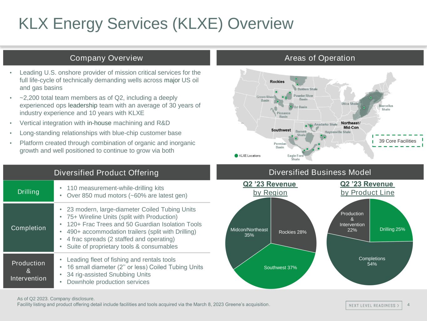 4 Rockies 28% Southwest 37% Midcon/Northeast 35% KLX Energy Services (KLXE) Overview Company Overview Areas of Operation Diversified Product Offering Diversified Business Model • Leading U.S. onshore provider of mission critical services for the full life-cycle of technically demanding wells across major US oil and gas basins • ~2,200 total team members as of Q2, including a deeply experienced ops leadership team with an average of 30 years of industry experience and 10 years with KLXE • Vertical integration with in-house machining and R&D • Long-standing relationships with blue-chip customer base • Platform created through combination of organic and inorganic growth and well positioned to continue to grow via both Q2 ’23 Revenue by Product Line Q2 ’23 Revenue by RegionDrilling • 110 measurement-while-drilling kits • Over 850 mud motors (~60% are latest gen) Completion • 23 modern, large-diameter Coiled Tubing Units • 75+ Wireline Units (split with Production) • 120+ Frac Trees and 50 Guardian Isolation Tools • 490+ accommodation trailers (split with Drilling) • 4 frac spreads (2 staffed and operating) • Suite of proprietary tools & consumables Production & Intervention • Leading fleet of fishing and rentals tools • 16 small diameter (2’’ or less) Coiled Tubing Units • 34 rig-assisted Snubbing Units • Downhole production services As of Q2 2023. Company disclosure. Facility listing and product offering detail include facilities and tools acquired via the March 8, 2023 Greene’s acquisition . 39 Core Facilities Drilling 25% Completions 54% Production & Intervention 22%