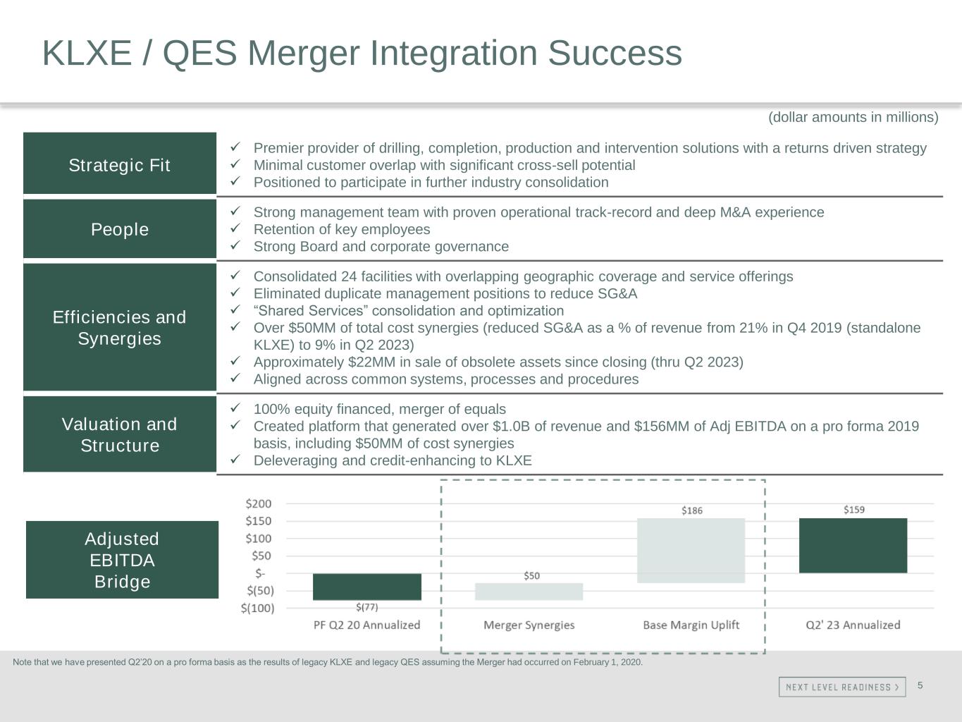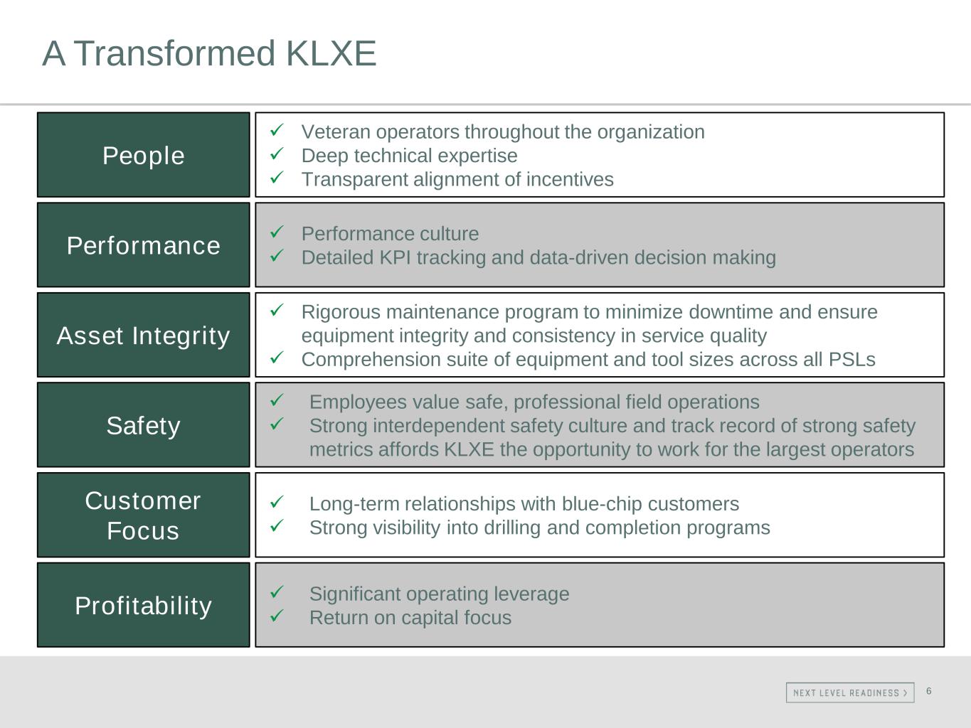 5 KLXE / QES Merger Integration Success Strategic Fit ✓ Premier provider of drilling, completion, production and intervention solutions with a returns driven strategy ✓ Minimal customer overlap with significant cross-sell potential ✓ Positioned to participate in further industry consolidation People ✓ Strong management team with proven operational track-record and deep M&A experience ✓ Retention of key employees ✓ Strong Board and corporate governance Efficiencies and Synergies ✓ Consolidated 24 facilities with overlapping geographic coverage and service offerings ✓ Eliminated duplicate management positions to reduce SG&A ✓ “Shared Services” consolidation and optimization ✓ Over $50MM of total cost synergies (reduced SG&A as a % of revenue from 21% in Q4 2019 (standalone KLXE) to 9% in Q2 2023) ✓ Approximately $22MM in sale of obsolete assets since closing (thru Q2 2023) ✓ Aligned across common systems, processes and procedures Valuation and Structure ✓ 100% equity financed, merger of equals ✓ Created platform that generated over $1.0B of revenue and $156MM of Adj EBITDA on a pro forma 2019 basis, including $50MM of cost synergies ✓ Deleveraging and credit-enhancing to KLXE (dollar amounts in millions) Adjusted EBITDA Bridge Note that we have presented Q2’20 on a pro forma basis as the results of legacy KLXE and legacy QES assuming the Merger had occurred on February 1, 2020.
