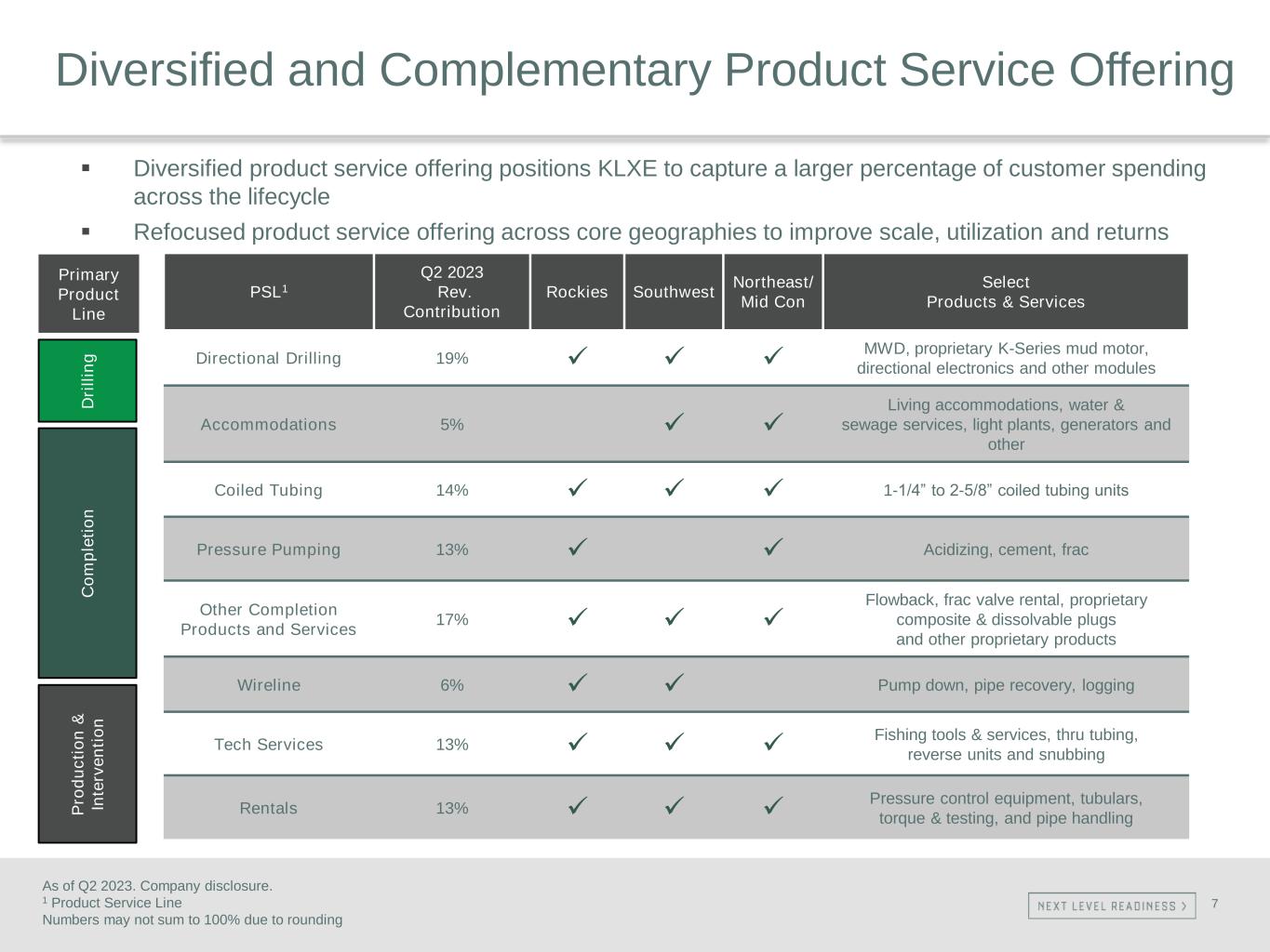 6 A Transformed KLXE People Performance Asset Integrity Safety Customer Focus Profitability ✓ Veteran operators throughout the organization ✓ Deep technical expertise ✓ Transparent alignment of incentives ✓ Significant operating leverage ✓ Return on capital focus ✓ Performance culture ✓ Detailed KPI tracking and data-driven decision making ✓ Rigorous maintenance program to minimize downtime and ensure equipment integrity and consistency in service quality ✓ Comprehension suite of equipment and tool sizes across all PSLs ✓ Employees value safe, professional field operations ✓ Strong interdependent safety culture and track record of strong safety metrics affords KLXE the opportunity to work for the largest operators ✓ Long-term relationships with blue-chip customers ✓ Strong visibility into drilling and completion programs