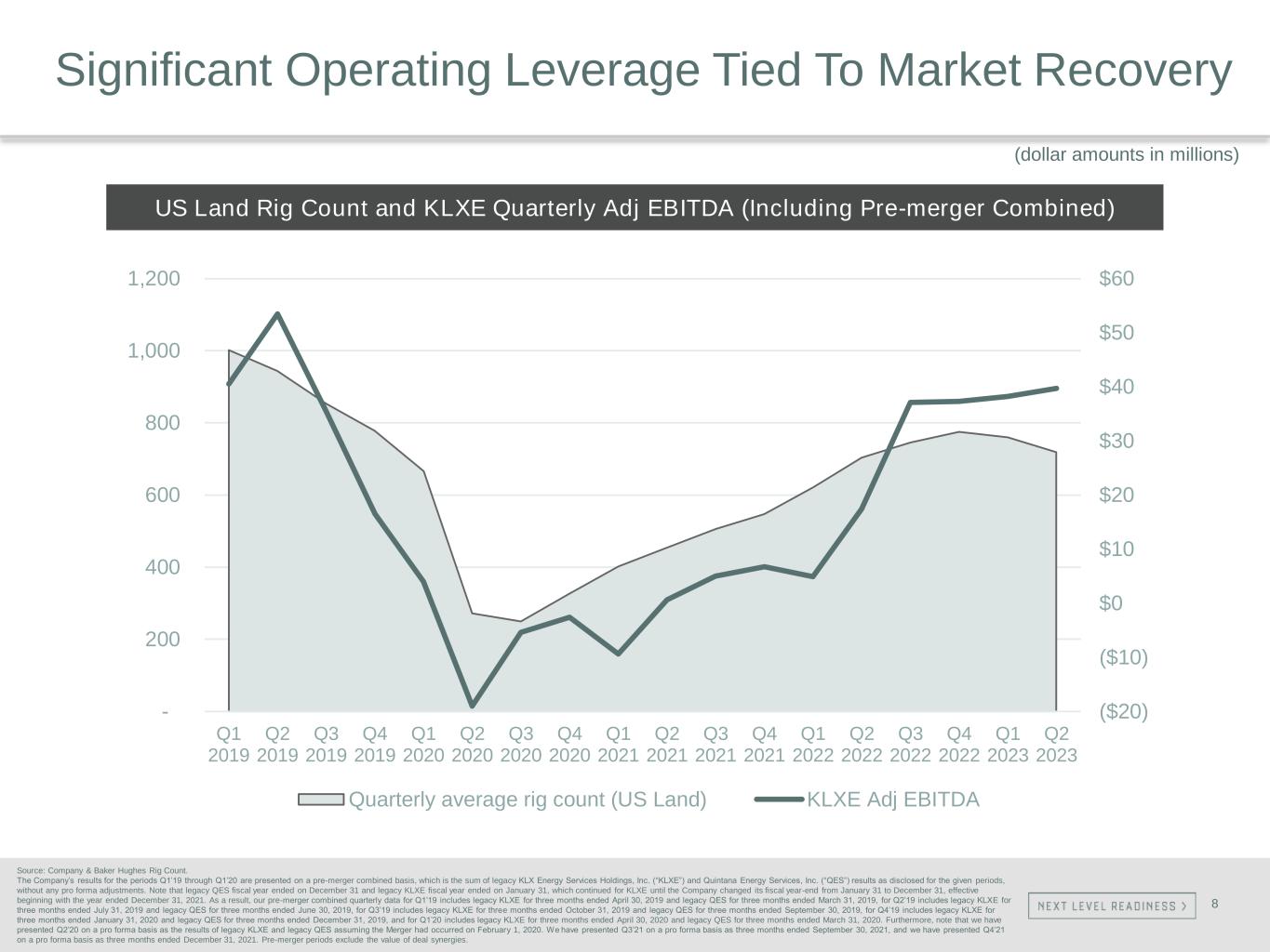 7 Diversified and Complementary Product Service Offering PSL1 Q2 2023 Rev. Contribution Rockies Southwest Northeast/ Mid Con Select Products & Services Directional Drilling 19% ✓ ✓ ✓ MWD, proprietary K-Series mud motor, directional electronics and other modules Accommodations 5% ✓ ✓ Living accommodations, water & sewage services, light plants, generators and other Coiled Tubing 14% ✓ ✓ ✓ 1-1/4” to 2-5/8” coiled tubing units Pressure Pumping 13% ✓ ✓ Acidizing, cement, frac Other Completion Products and Services 17% ✓ ✓ ✓ Flowback, frac valve rental, proprietary composite & dissolvable plugs and other proprietary products Wireline 6% ✓ ✓ Pump down, pipe recovery, logging Tech Services 13% ✓ ✓ ✓ Fishing tools & services, thru tubing, reverse units and snubbing Rentals 13% ✓ ✓ ✓ Pressure control equipment, tubulars, torque & testing, and pipe handling P ro d u c ti o n & In te rv e n ti o n C o m p le ti o n D ri ll in g As of Q2 2023. Company disclosure. 1 Product Service Line Numbers may not sum to 100% due to rounding Primary Product Line ▪ Diversified product service offering positions KLXE to capture a larger percentage of customer spending across the lifecycle ▪ Refocused product service offering across core geographies to improve scale, utilization and returns