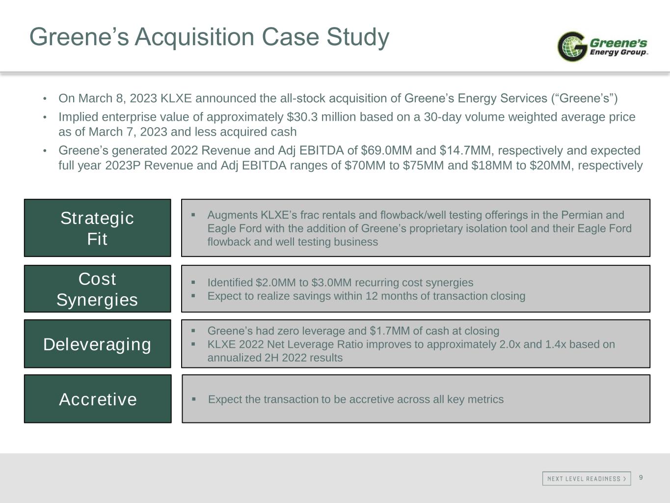 8 Significant Operating Leverage Tied To Market Recovery US Land Rig Count and KLXE Quarterly Adj EBITDA (Including Pre-merger Combined) Source: Company & Baker Hughes Rig Count. The Company’s results for the periods Q1’19 through Q1’20 are presented on a pre-merger combined basis, which is the sum of legacy KLX Energy Services Holdings, Inc. (“KLXE”) and Quintana Energy Services, Inc. (“QES”) results as disclosed for the given periods, without any pro forma adjustments. Note that legacy QES fiscal year ended on December 31 and legacy KLXE fiscal year ended on January 31, which continued for KLXE until the Company changed its fiscal year-end from January 31 to December 31, effective beginning with the year ended December 31, 2021. As a result, our pre-merger combined quarterly data for Q1’19 includes legacy KLXE for three months ended April 30, 2019 and legacy QES for three months ended March 31, 2019, for Q2’19 includes legacy KLXE for three months ended July 31, 2019 and legacy QES for three months ended June 30, 2019, for Q3’19 includes legacy KLXE for three months ended October 31, 2019 and legacy QES for three months ended September 30, 2019, for Q4’19 includes legacy KLXE for three months ended January 31, 2020 and legacy QES for three months ended December 31, 2019, and for Q1’20 includes legacy KLXE for three months ended April 30, 2020 and legacy QES for three months ended March 31, 2020. Furthermore, note that we have presented Q2’20 on a pro forma basis as the results of legacy KLXE and legacy QES assuming the Merger had occurred on February 1, 2020. We have presented Q3’21 on a pro forma basis as three months ended September 30, 2021, and we have presented Q4’21 on a pro forma basis as three months ended December 31, 2021. Pre-merger periods exclude the value of deal synergies. (dollar amounts in millions) ($20) ($10) $0 $10 $20 $30 $40 $50 $60 - 200 400 600 800 1,000 1,200 Q1 2019 Q2 2019 Q3 2019 Q4 2019 Q1 2020 Q2 2020 Q3 2020 Q4 2020 Q1 2021 Q2 2021 Q3 2021 Q4 2021 Q1 2022 Q2 2022 Q3 2022 Q4 2022 Q1 2023 Q2 2023 Quarterly average rig count (US Land) KLXE Adj EBITDA