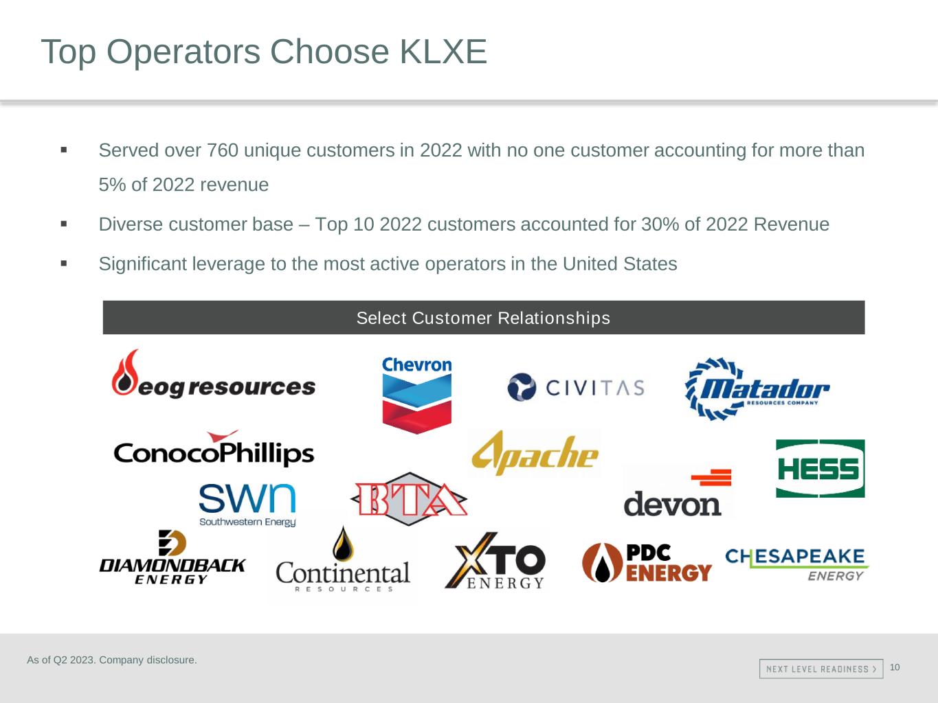 10 Top Operators Choose KLXE ▪ Served over 760 unique customers in 2022 with no one customer accounting for more than 5% of 2022 revenue ▪ Diverse customer base – Top 10 2022 customers accounted for 30% of 2022 Revenue ▪ Significant leverage to the most active operators in the United States As of Q2 2023. Company disclosure. Select Customer Relationships