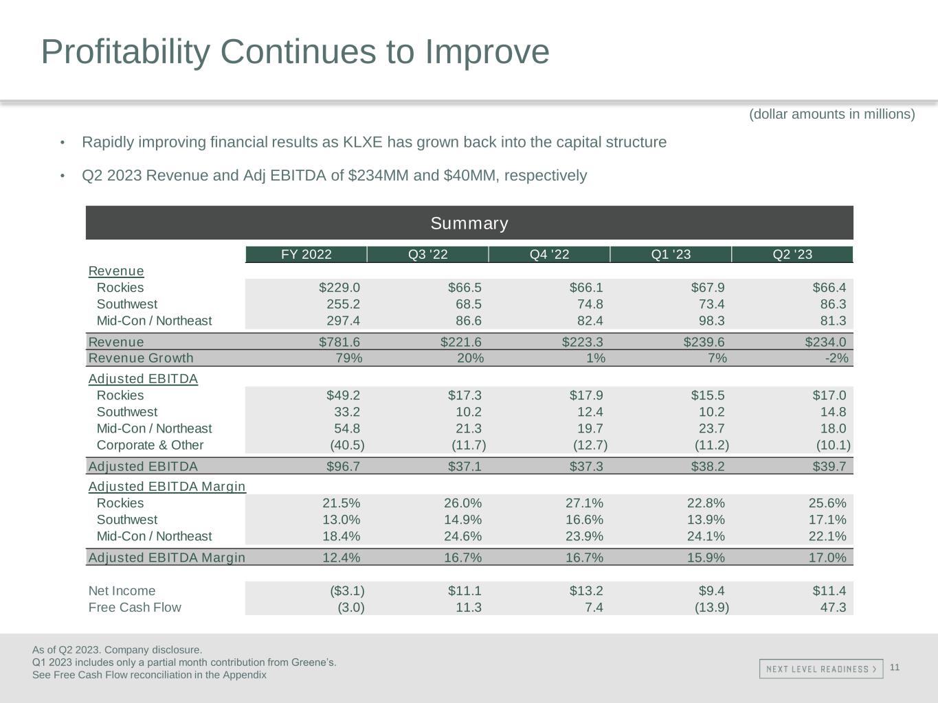 9 Greene’s Acquisition Case Study Cost Synergies ▪ Identified $2.0MM to $3.0MM recurring cost synergies ▪ Expect to realize savings within 12 months of transaction closing Accretive ▪ Expect the transaction to be accretive across all key metrics Deleveraging ▪ Greene’s had zero leverage and $1.7MM of cash at closing ▪ KLXE 2022 Net Leverage Ratio improves to approximately 2.0x and 1.4x based on annualized 2H 2022 results Strategic Fit ▪ Augments KLXE’s frac rentals and flowback/well testing offerings in the Permian and Eagle Ford with the addition of Greene’s proprietary isolation tool and their Eagle Ford flowback and well testing business • On March 8, 2023 KLXE announced the all-stock acquisition of Greene’s Energy Services (“Greene’s”) • Implied enterprise value of approximately $30.3 million based on a 30-day volume weighted average price as of March 7, 2023 and less acquired cash • Greene’s generated 2022 Revenue and Adj EBITDA of $69.0MM and $14.7MM, respectively and expected full year 2023P Revenue and Adj EBITDA ranges of $70MM to $75MM and $18MM to $20MM, respectively
