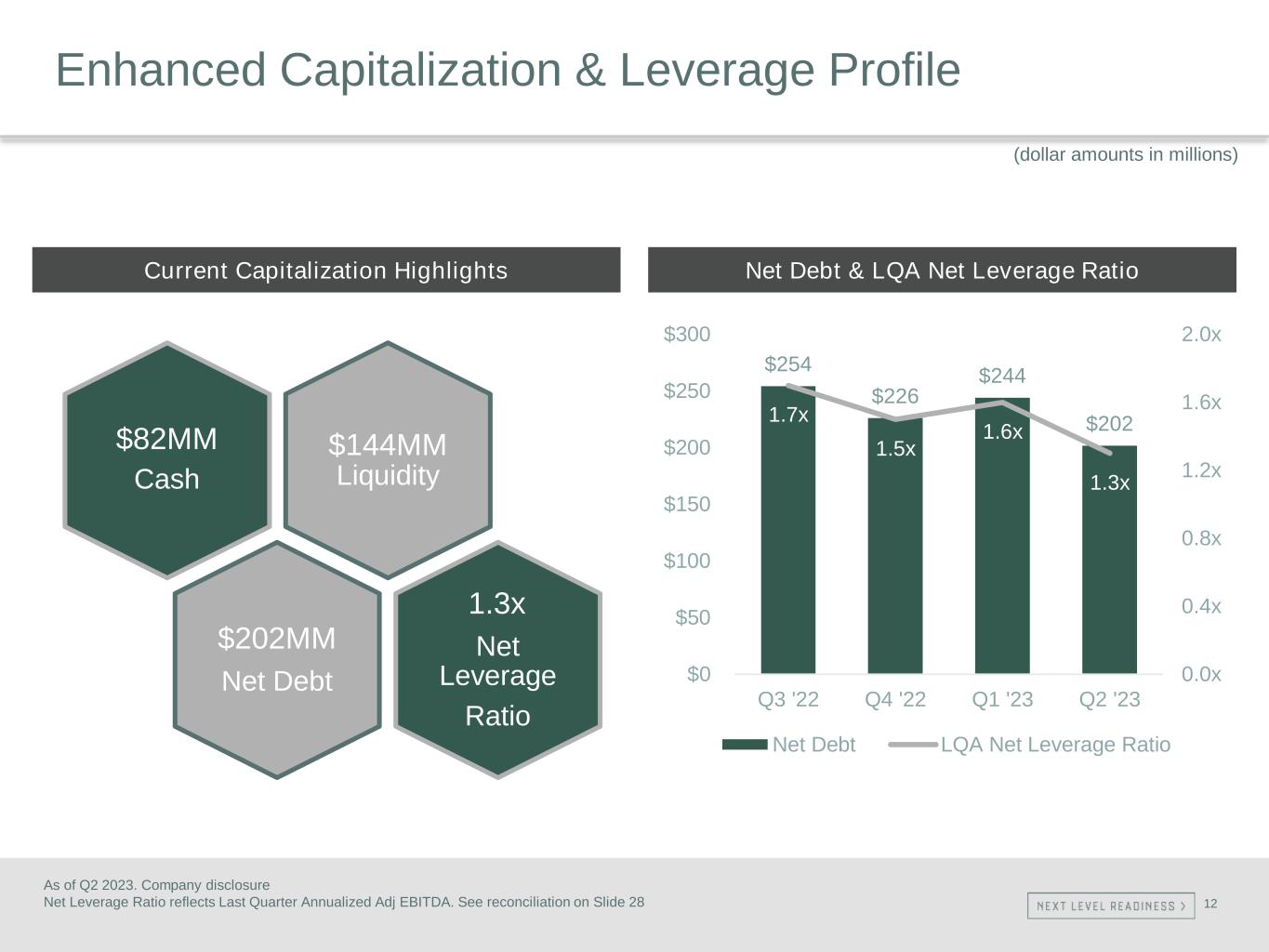 12 Enhanced Capitalization & Leverage Profile As of Q2 2023. Company disclosure Net Leverage Ratio reflects Last Quarter Annualized Adj EBITDA. See reconciliation on Slide 28 Net Debt & LQA Net Leverage Ratio (dollar amounts in millions) Current Capitalization Highlights $254 $226 $244 $202 1.7x 1.5x 1.6x 1.3x 0.0x 0.4x 0.8x 1.2x 1.6x 2.0x $0 $50 $100 $150 $200 $250 $300 Q3 '22 Q4 '22 Q1 '23 Q2 '23 Net Debt LQA Net Leverage Ratio $144MM Liquidity $82MM Cash $202MM Net Debt 1.3x Net Leverage Ratio