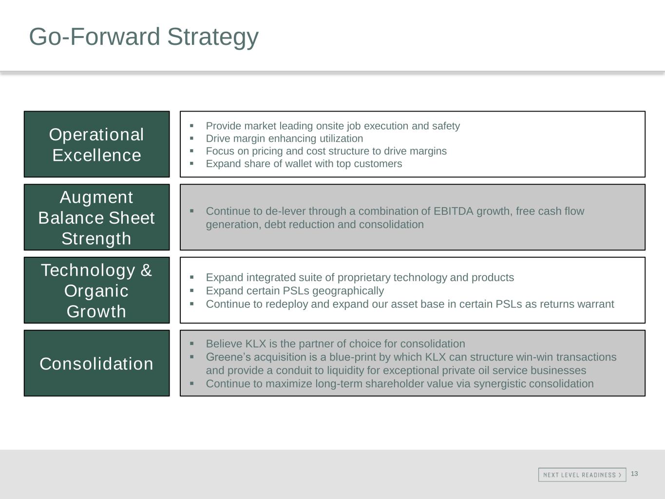 13 Go-Forward Strategy Augment Balance Sheet Strength ▪ Continue to de-lever through a combination of EBITDA growth, free cash flow generation, debt reduction and consolidation Consolidation ▪ Believe KLX is the partner of choice for consolidation ▪ Greene’s acquisition is a blue-print by which KLX can structure win-win transactions and provide a conduit to liquidity for exceptional private oil service businesses ▪ Continue to maximize long-term shareholder value via synergistic consolidation Technology & Organic Growth ▪ Expand integrated suite of proprietary technology and products ▪ Expand certain PSLs geographically ▪ Continue to redeploy and expand our asset base in certain PSLs as returns warrant Operational Excellence ▪ Provide market leading onsite job execution and safety ▪ Drive margin enhancing utilization ▪ Focus on pricing and cost structure to drive margins ▪ Expand share of wallet with top customers