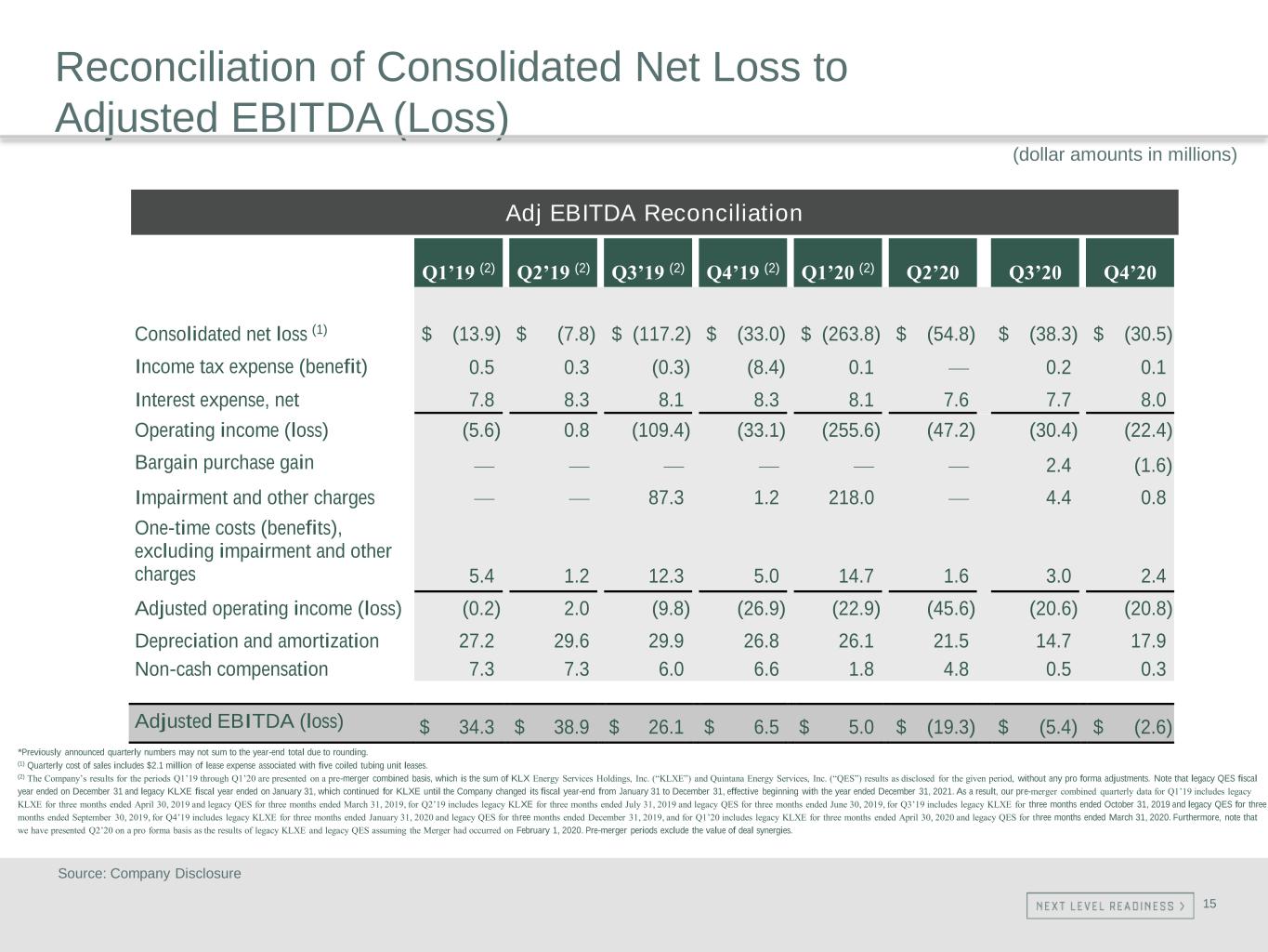 15 Reconciliation of Consolidated Net Loss to Adjusted EBITDA (Loss) (dollar amounts in millions) Source: Company Disclosure Adj EBITDA Reconciliation *Previously announced quarterly numbers may not sum to the year-end total due to rounding. (1) Quarterly cost of sales includes $2.1 million of lease expense associated with five coiled tubing unit leases. (2) The Company’s results for the periods Q1’19 through Q1’20 are presented on a pre-merger combined basis, which is the sum of KLX Energy Services Holdings, Inc. (“KLXE”) and Quintana Energy Services, Inc. (“QES”) results as disclosed for the given period, without any pro forma adjustments. Note that legacy QES fiscal year ended on December 31 and legacy KLXE fiscal year ended on January 31, which continued for KLXE until the Company changed its fiscal year-end from January 31 to December 31, effective beginning with the year ended December 31, 2021. As a result, our pre-merger combined quarterly data for Q1’19 includes legacy KLXE for three months ended April 30, 2019 and legacy QES for three months ended March 31, 2019, for Q2’19 includes legacy KLXE for three months ended July 31, 2019 and legacy QES for three months ended June 30, 2019, for Q3’19 includes legacy KLXE for three months ended October 31, 2019 and legacy QES for three months ended September 30, 2019, for Q4’19 includes legacy KLXE for three months ended January 31, 2020 and legacy QES for three months ended December 31, 2019, and for Q1’20 includes legacy KLXE for three months ended April 30, 2020 and legacy QES for three months ended March 31, 2020. Furthermore, note that we have presented Q2’20 on a pro forma basis as the results of legacy KLXE and legacy QES assuming the Merger had occurred on February 1, 2020. Pre-merger periods exclude the value of deal synergies. Q1’19 (2) Q2’19 (2) Q3’19 (2) Q4’19 (2) Q1’20 (2) Q2’20 Q3’20 Q4’20 Consolidated net loss (1) $ (13.9) $ (7.8) $ (117.2) $ (33.0) $ (263.8) $ (54.8) $ (38.3) $ (30.5) Income tax expense (benefit) .................................................... 0.5 0.3 (0.3) (8.4) 0.1 — 0.2 0.1 Interest expense, net .................................................... 7.8 8.3 8.1 8.3 8.1 7.6 7.7 8.0 Operating income (loss) .................................................... (5.6) 0.8 (109.4) (33.1) (255.6) (47.2) (30.4) (22.4) Bargain purchase gain .................................................... — — — — — — 2.4 (1.6) Impairment and other charges .................................................... — — 87.3 1.2 218.0 — 4.4 0.8 One-time costs (benefits), excluding impairment and other charges .................................................... 5.4 1.2 12.3 5.0 14.7 1.6 3.0 2.4 Adjusted operating income (loss) .................................................... (0.2) 2.0 (9.8) (26.9) (22.9) (45.6) (20.6) (20.8) Depreciation and amortization .................................................... 27.2 29.6 29.9 26.8 26.1 21.5 14.7 17.9 Non-cash compensation .................................................... 7.3 7.3 6.0 6.6 1.8 4.8 0.5 0.3 Adjusted EBITDA (loss) .................................................... $ 34.3 $ 38.9 $ 26.1 $ 6.5 $ 5.0 $ (19.3) $ (5.4) $ (2.6)