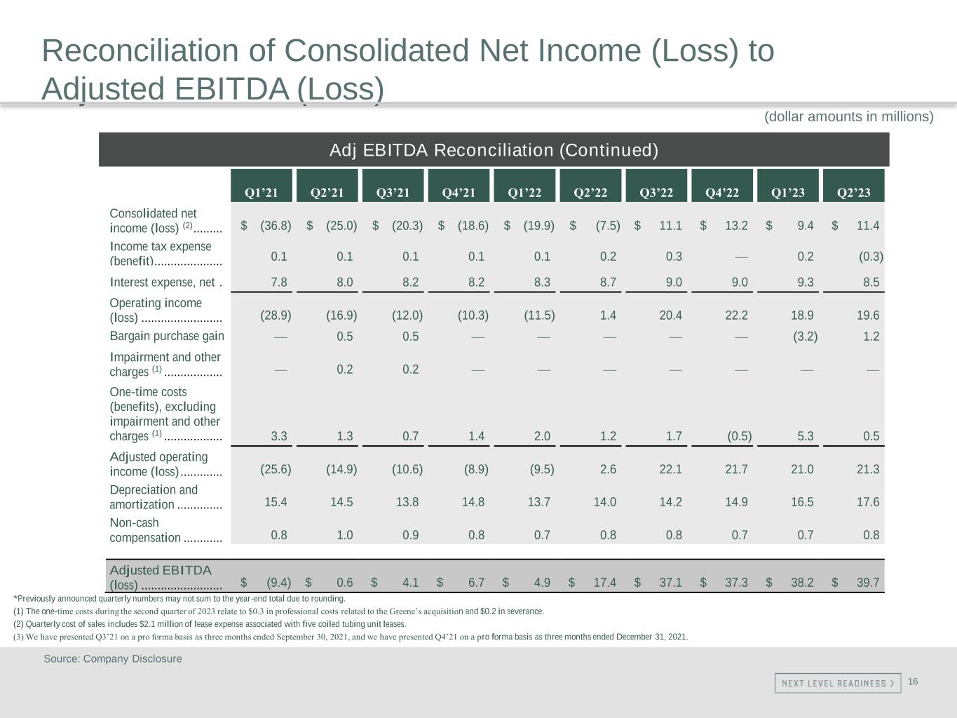16 Reconciliation of Consolidated Net Income (Loss) to Adjusted EBITDA (Loss) (dollar amounts in millions) Source: Company Disclosure Adj EBITDA Reconciliation (Continued) *Previously announced quarterly numbers may not sum to the year-end total due to rounding. (1) The one-time costs during the second quarter of 2023 relate to $0.3 in professional costs related to the Greene’s acquisition and $0.2 in severance. (2) Quarterly cost of sales includes $2.1 million of lease expense associated with five coiled tubing unit leases. (3) We have presented Q3’21 on a pro forma basis as three months ended September 30, 2021, and we have presented Q4’21 on a pro forma basis as three months ended December 31, 2021. Q1’21 Q2’21 Q3’21 Q4’21 Q1’22 Q2’22 Q3’22 Q4’22 Q1’23 Q2’23 Consolidated net income (loss) (2) ......... $ (36.8) $ (25.0) $ (20.3) $ (18.6) $ (19.9) $ (7.5) $ 11.1 $ 13.2 $ 9.4 $ 11.4 Income tax expense (benefit) ..................... 0.1 0.1 0.1 0.1 0.1 0.2 0.3 — 0.2 (0.3) Interest expense, net . 7.8 8.0 8.2 8.2 8.3 8.7 9.0 9.0 9.3 8.5 Operating income (loss) ......................... (28.9) (16.9) (12.0) (10.3) (11.5) 1.4 20.4 22.2 18.9 19.6 Bargain purchase gain .................................. — 0.5 0.5 — — — — — (3.2) 1.2 Impairment and other charges (1) .................. — 0.2 0.2 — — — — — — — One-time costs (benefits), excluding impairment and other charges (1) .................. 3.3 1.3 0.7 1.4 2.0 1.2 1.7 (0.5) 5.3 0.5 Adjusted operating income (loss) ............. (25.6) (14.9) (10.6) (8.9) (9.5) 2.6 22.1 21.7 21.0 21.3 Depreciation and amortization .............. 15.4 14.5 13.8 14.8 13.7 14.0 14.2 14.9 16.5 17.6 Non-cash compensation ............ 0.8 1.0 0.9 0.8 0.7 0.8 0.8 0.7 0.7 0.8 Adjusted EBITDA (loss) ......................... $ (9.4) $ 0.6 $ 4.1 $ 6.7 $ 4.9 $ 17.4 $ 37.1 $ 37.3 $ 38.2 $ 39.7