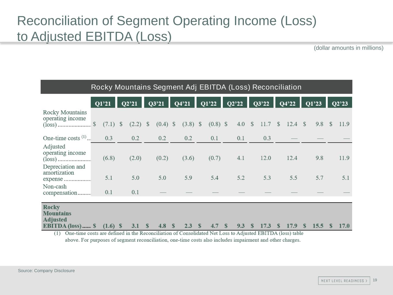 18 Consolidated Adjusted EBITDA (Loss) Margin Reconciliation Source: Company Disclosure Consolidated Adjusted EBITDA (Loss) Margin Reconciliation (dollar amounts in millions) Q1’21 Q2’21 Q3’21 Q4’21 Q1’22 Q2’22 Q3’22 Q4’22 Q1’23 Q2’23 Adjusted EBITDA (loss) ............................. $ (9.4) $ 0.6 $ 4.1 $ 6.7 $ 4.9 $ 17.4 $ 37.1 $ 37.3 $ 38.2 $ 39.7 Revenue .............................. 90.8 111.9 128.3 145.0 152.3 184.4 221.6 223.3 239.6 234.0 Consolidated Adjusted EBITDA (loss) margin .............................. (10.3) % 0.5 % 3.2 % 4.6 % 3.2 % 9.4 % 16.7 % 16.7 % 15.9 % 17.0 %