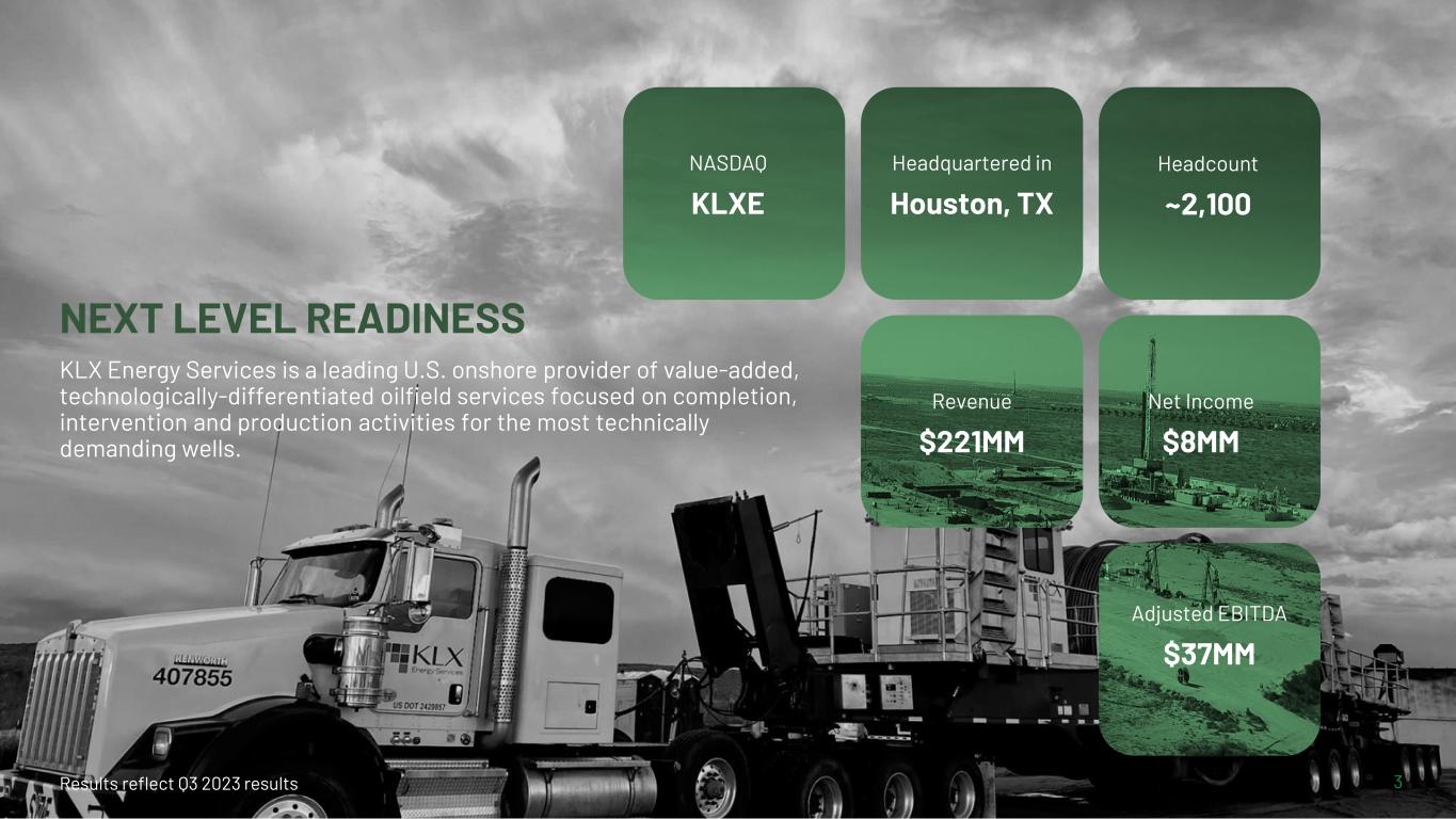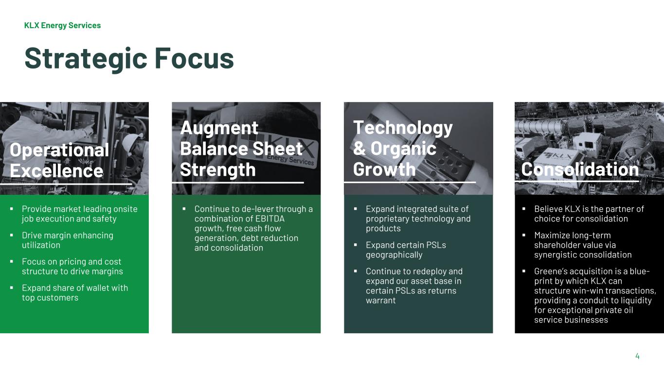 3 NEXT LEVEL READINESS KLX Energy Services is a leading U.S. onshore provider of value-added, technologically-differentiated oilfield services focused on completion, intervention and production activities for the most technically demanding wells. NASDAQ KLXE Headquartered in Houston, TX Headcount ~2,100 Revenue $221MM Net Income $8MM Adjusted EBITDA $37MM Results reflect Q3 2023 results