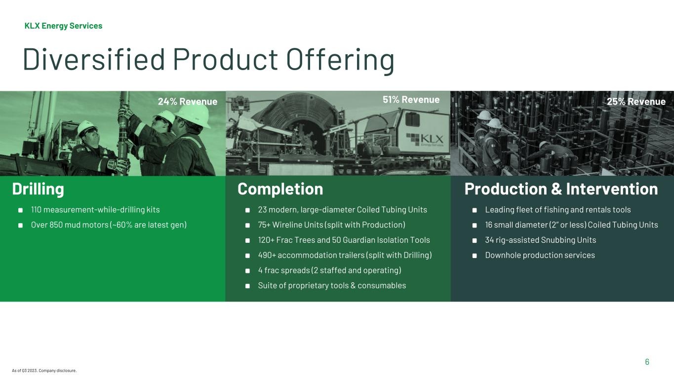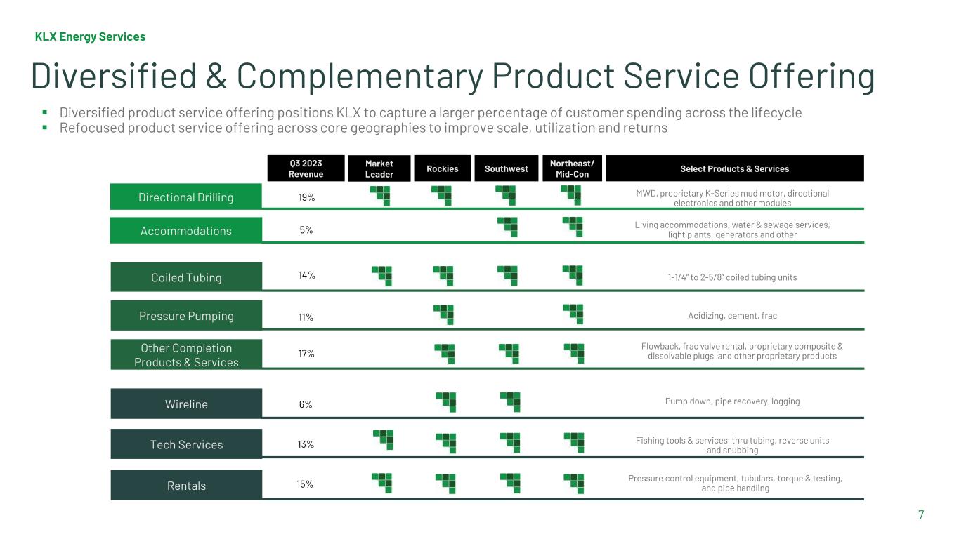 Drilling Completion KLX Energy Services 6 110 measurement-while-drilling kits Over 850 mud motors (~60% are latest gen) 23 modern, large-diameter Coiled Tubing Units 75+ Wireline Units (split with Production) 120+ Frac Trees and 50 Guardian Isolation Tools 490+ accommodation trailers (split with Drilling) 4 frac spreads (2 staffed and operating) Suite of proprietary tools & consumables Production & Intervention Leading fleet of fishing and rentals tools 16 small diameter (2’’ or less) Coiled Tubing Units 34 rig-assisted Snubbing Units Downhole production services Diversified Product Offering As of Q3 2023. Company disclosure. 24% Revenue 51% Revenue 25% Revenue