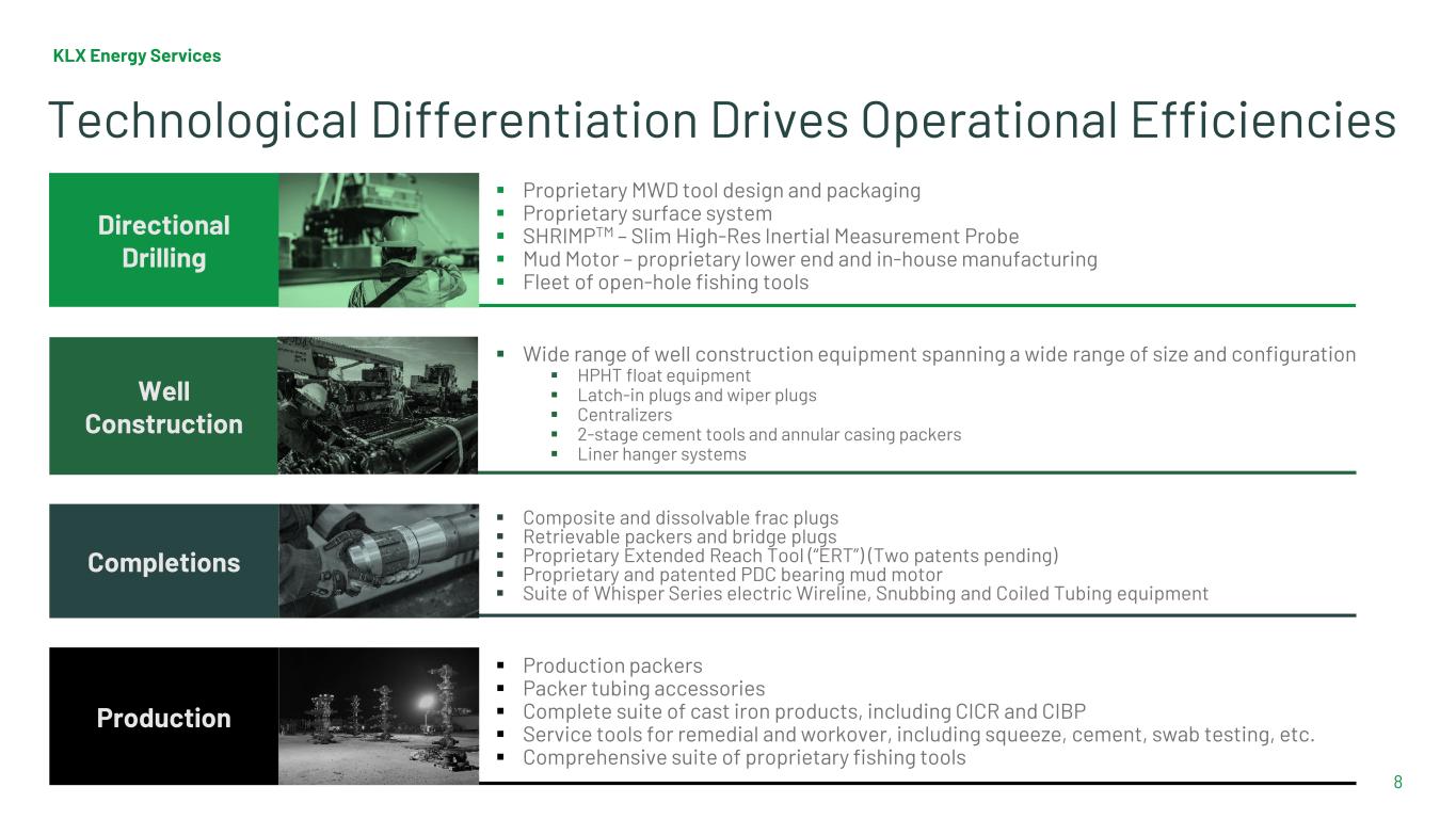 KLX Energy Services 7 Diversified & Complementary Product Service Offering  Diversified product service offering positions KLX to capture a larger percentage of customer spending across the lifecycle  Refocused product service offering across core geographies to improve scale, utilization and returns MWD, proprietary K-Series mud motor, directional electronics and other modulesDirectional Drilling Pressure Pumping Wireline Accommodations Coiled Tubing Other Completion Products & Services Tech Services Rentals Living accommodations, water & sewage services, light plants, generators and other 1-1/4” to 2-5/8” coiled tubing units Acidizing, cement, frac Flowback, frac valve rental, proprietary composite & dissolvable plugs and other proprietary products Pump down, pipe recovery, logging Fishing tools & services, thru tubing, reverse units and snubbing Pressure control equipment, tubulars, torque & testing, and pipe handling Q3 2023 Revenue Market Leader Rockies Southwest Northeast/ Mid-Con Select Products & Services 19% 5% 14% 11% 17% 6% 13% 15%