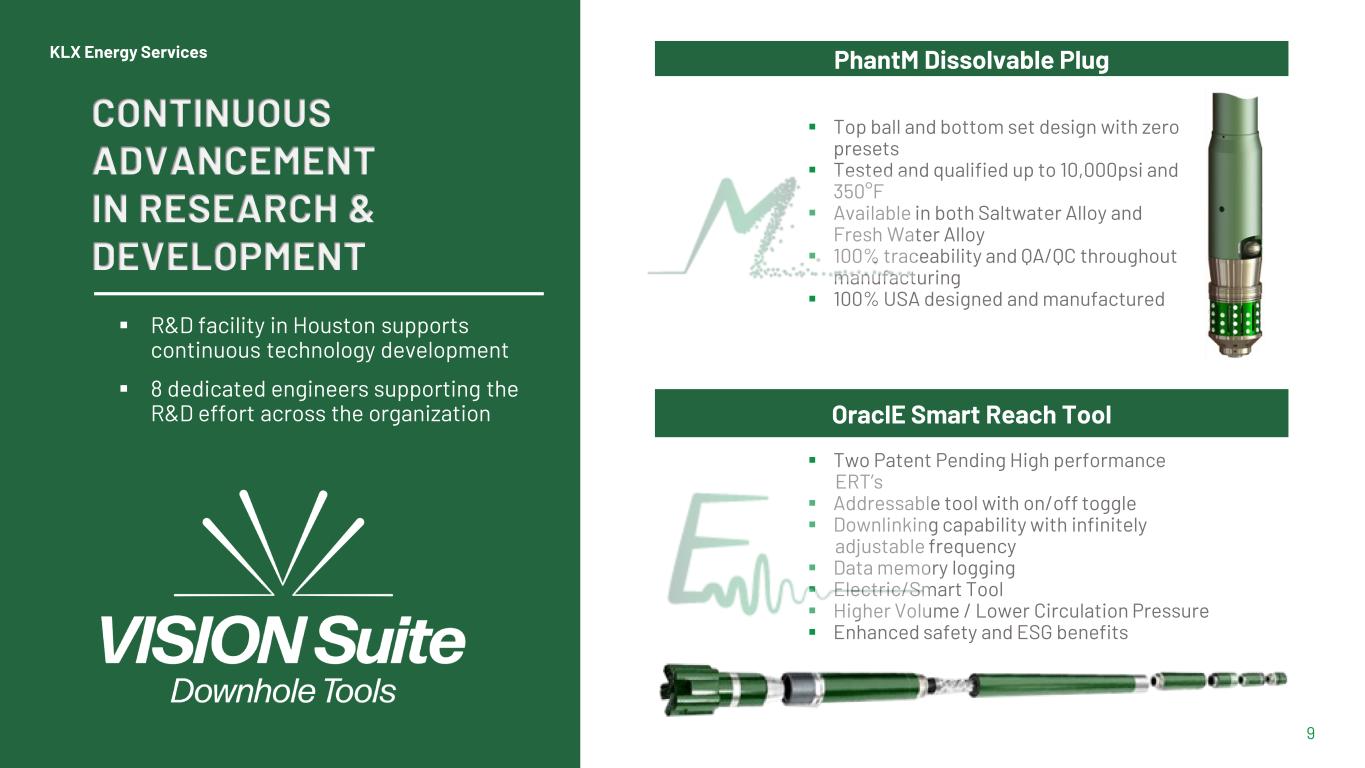  Wide range of well construction equipment spanning a wide range of size and configuration  HPHT float equipment  Latch-in plugs and wiper plugs  Centralizers  2-stage cement tools and annular casing packers  Liner hanger systems  Proprietary MWD tool design and packaging  Proprietary surface system  SHRIMPTM – Slim High-Res Inertial Measurement Probe  Mud Motor – proprietary lower end and in-house manufacturing  Fleet of open-hole fishing tools KLX Energy Services 8 Directional Drilling Well Construction Completions Production  Composite and dissolvable frac plugs  Retrievable packers and bridge plugs  Proprietary Extended Reach Tool (“ERT”) (Two patents pending)  Proprietary and patented PDC bearing mud motor  Suite of Whisper Series electric Wireline, Snubbing and Coiled Tubing equipment  Production packers  Packer tubing accessories  Complete suite of cast iron products, including CICR and CIBP  Service tools for remedial and workover, including squeeze, cement, swab testing, etc.  Comprehensive suite of proprietary fishing tools Technological Differentiation Drives Operational Efficiencies