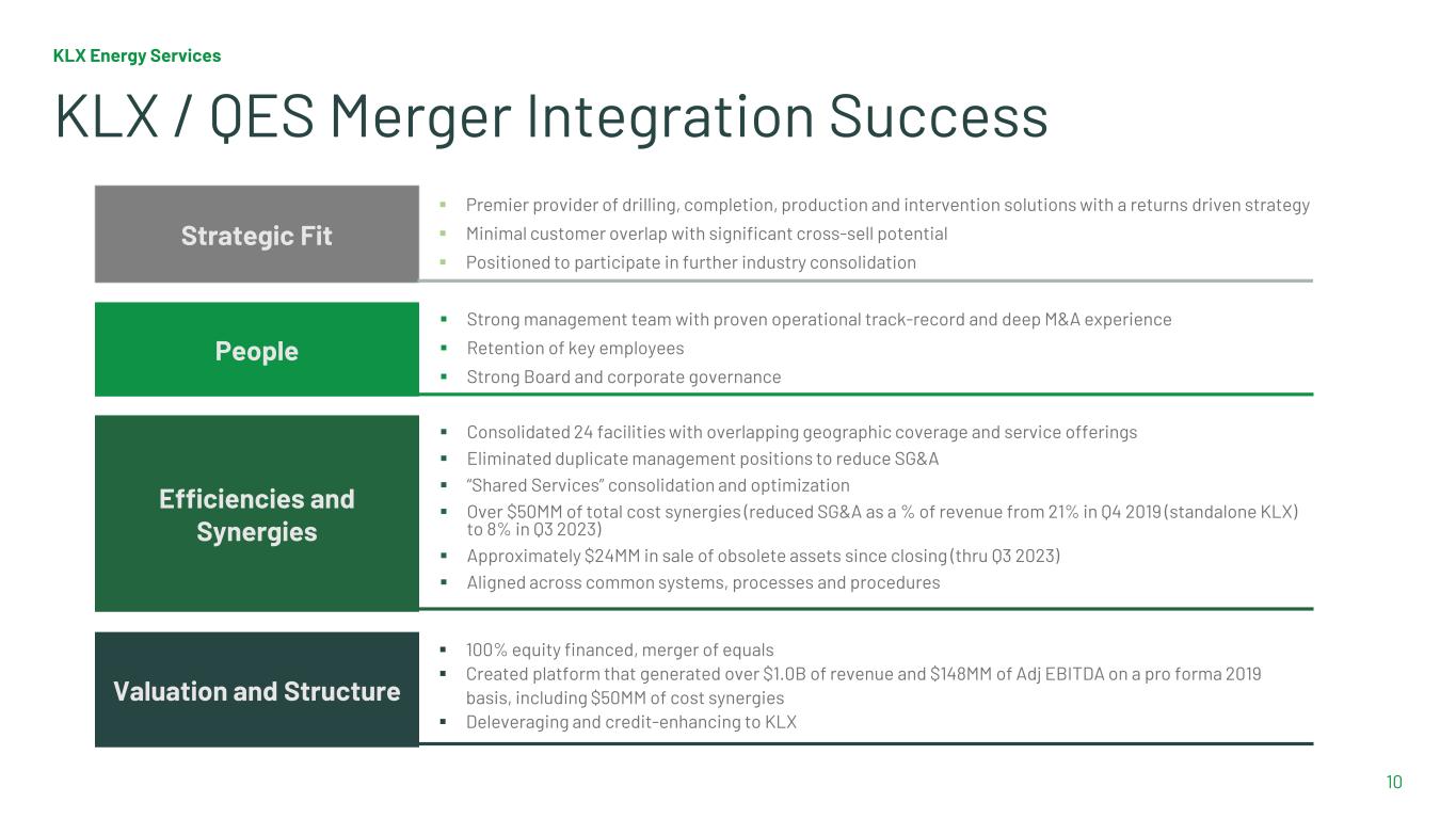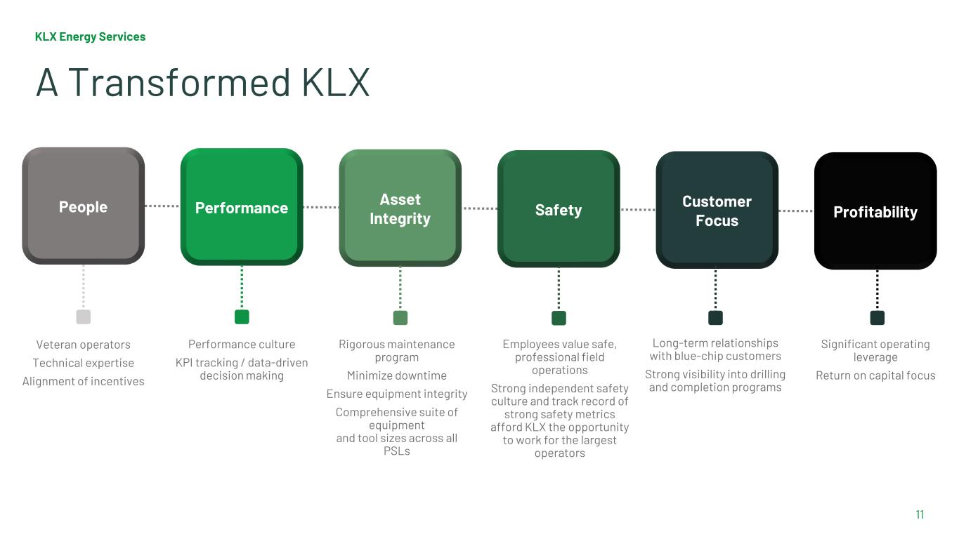  Strong management team with proven operational track-record and deep M&A experience  Retention of key employees  Strong Board and corporate governance  Premier provider of drilling, completion, production and intervention solutions with a returns driven strategy  Minimal customer overlap with significant cross-sell potential  Positioned to participate in further industry consolidation KLX Energy Services 10 Strategic Fit People Efficiencies and Synergies Valuation and Structure  Consolidated 24 facilities with overlapping geographic coverage and service offerings  Eliminated duplicate management positions to reduce SG&A  “Shared Services” consolidation and optimization  Over $50MM of total cost synergies (reduced SG&A as a % of revenue from 21% in Q4 2019 (standalone KLX) to 8% in Q3 2023)  Approximately $24MM in sale of obsolete assets since closing (thru Q3 2023)  Aligned across common systems, processes and procedures  100% equity financed, merger of equals  Created platform that generated over $1.0B of revenue and $148MM of Adj EBITDA on a pro forma 2019 basis, including $50MM of cost synergies  Deleveraging and credit-enhancing to KLX KLX / QES Merger Integration Success