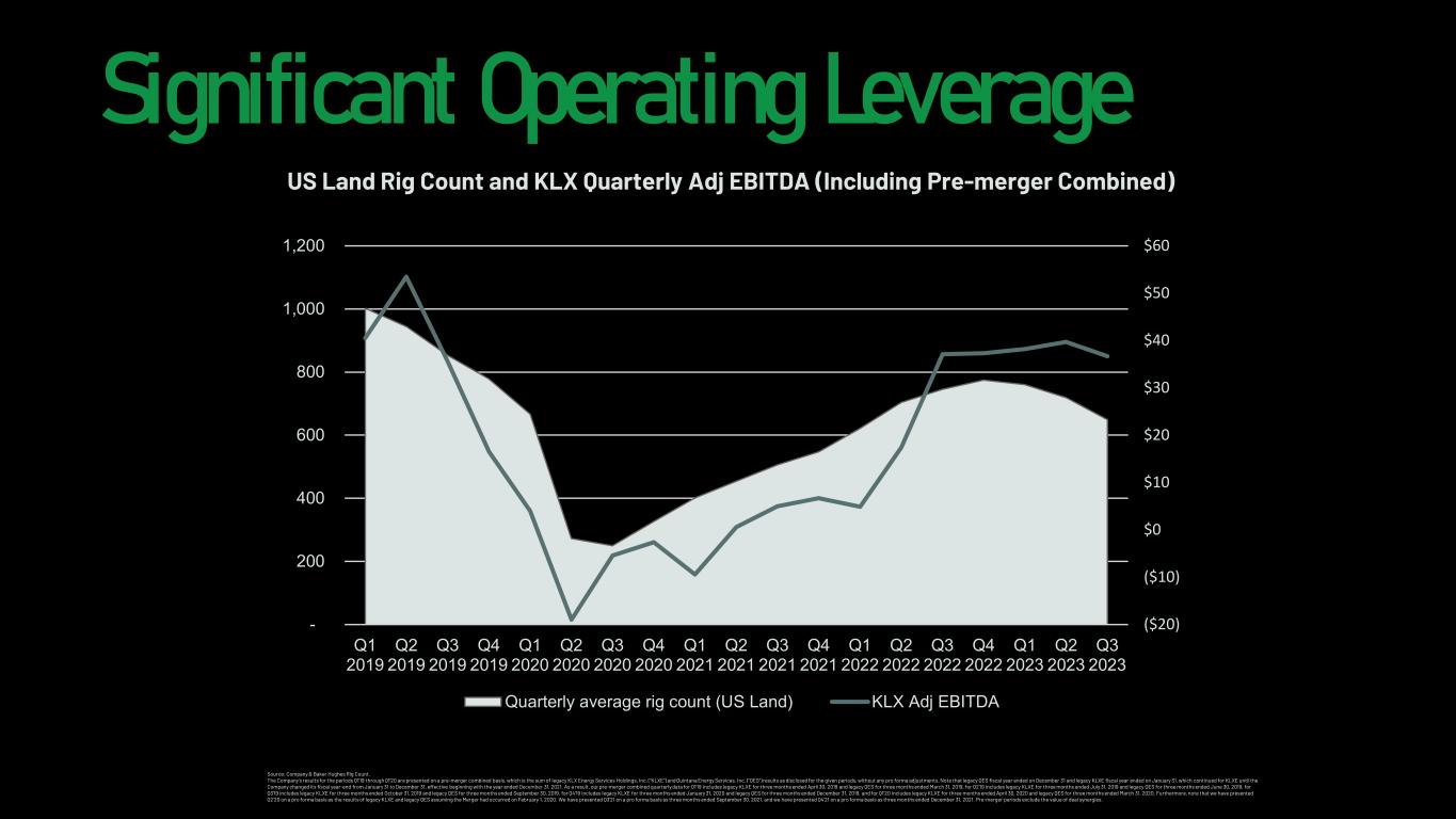 Significant Operating Leverage US Land Rig Count and KLX Quarterly Adj EBITDA (Including Pre-merger Combined) Source: Company & Baker Hughes Rig Count. The Company’s results for the periods Q1’19 through Q1’20 are presented on a pre-merger combined basis, which is the sum of legacy KLX Energy Services Holdings, Inc. (“KLXE”) and Quintana Energy Services, Inc. (“QES”) results as disclosed for the given periods, without any pro forma adjustments. Note that legacy QES fiscal year ended on December 31 and legacy KLXE fiscal year ended on January 31, which continued for KLXE until the Company changed its fiscal year-end from January 31 to December 31, effective beginning with the year ended December 31, 2021. As a result, our pre-merger combined quarterly data for Q1’19 includes legacy KLXE for three months ended April 30, 2019 and legacy QES for three months ended March 31, 2019, for Q2’19 includes legacy KLXE for three months ended July 31, 2019 and legacy QES for three months ended June 30, 2019, for Q3’19 includes legacy KLXE for three months ended October 31, 2019 and legacy QES for three months ended September 30, 2019, for Q4’19 includes legacy KLXE for three months ended January 31, 2020 and legacy QES for three months ended December 31, 2019, and for Q1’20 includes legacy KLXE for three months ended April 30, 2020 and legacy QES for three months ended March 31, 2020. Furthermore, note that we have presented Q2’20 on a pro forma basis as the results of legacy KLXE and legacy QES assuming the Merger had occurred on February 1, 2020. We have presented Q3’21 on a pro forma basis as three months ended September 30, 2021, and we have presented Q4’21 on a pro forma basis as three months ended December 31, 2021. Pre-merger periods exclude the value of deal synergies. ($20) ($10) $0 $10 $20 $30 $40 $50 $60 - 200 400 600 800 1,000 1,200 Q1 2019 Q2 2019 Q3 2019 Q4 2019 Q1 2020 Q2 2020 Q3 2020 Q4 2020 Q1 2021 Q2 2021 Q3 2021 Q4 2021 Q1 2022 Q2 2022 Q3 2022 Q4 2022 Q1 2023 Q2 2023 Q3 2023 Quarterly average rig count (US Land) KLX Adj EBITDA
