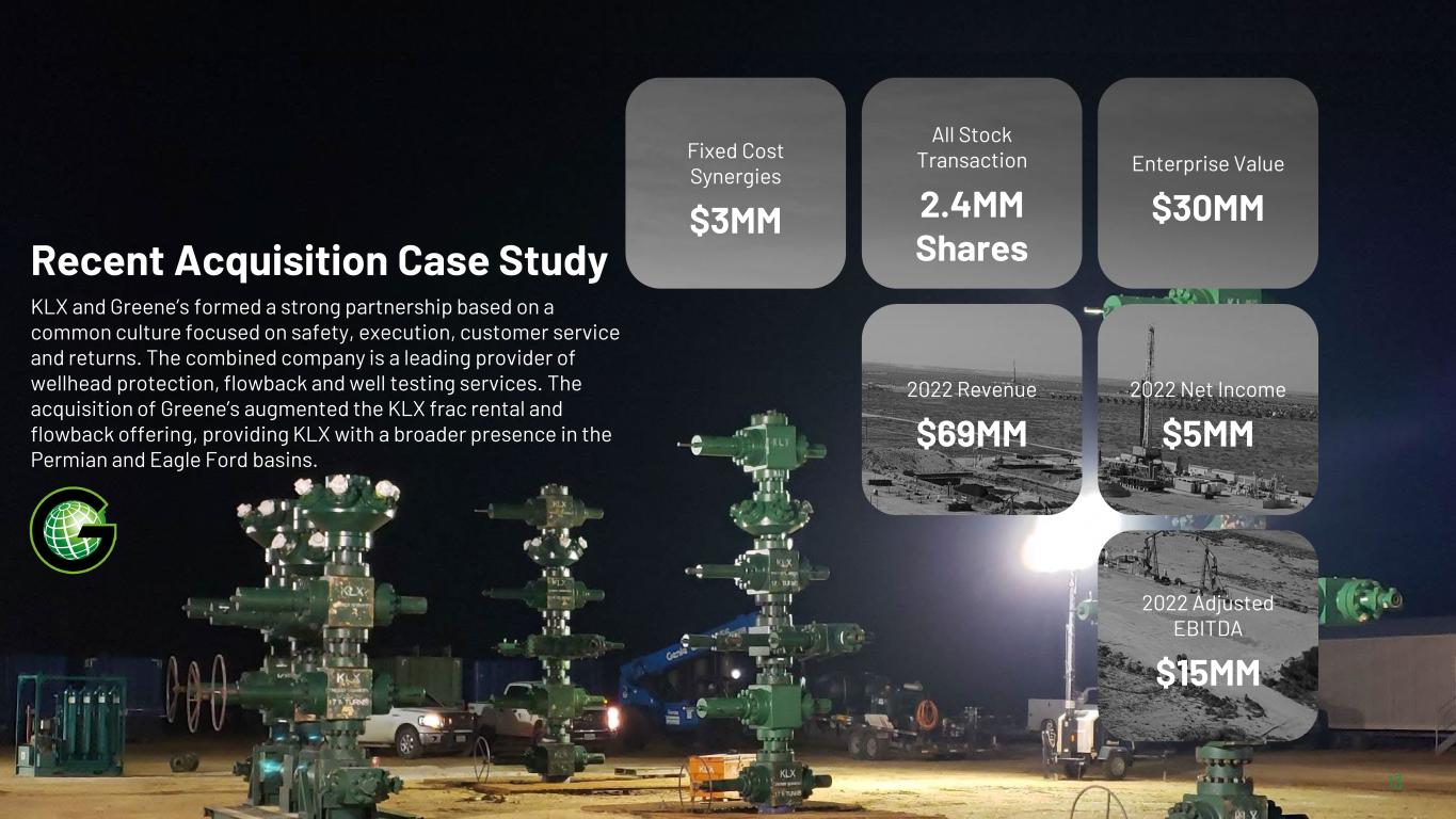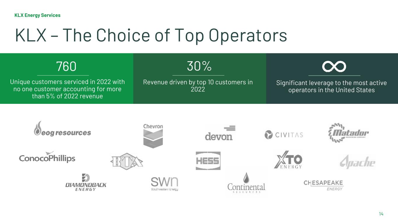 13 Recent Acquisition Case Study KLX and Greene’s formed a strong partnership based on a common culture focused on safety, execution, customer service and returns. The combined company is a leading provider of wellhead protection, flowback and well testing services. The acquisition of Greene’s augmented the KLX frac rental and flowback offering, providing KLX with a broader presence in the Permian and Eagle Ford basins. 2022 Adjusted EBITDA $15MM 2022 Revenue $69MM All Stock Transaction 2.4MM Shares Enterprise Value $30MM 2022 Net Income $5MM Fixed Cost Synergies $3MM