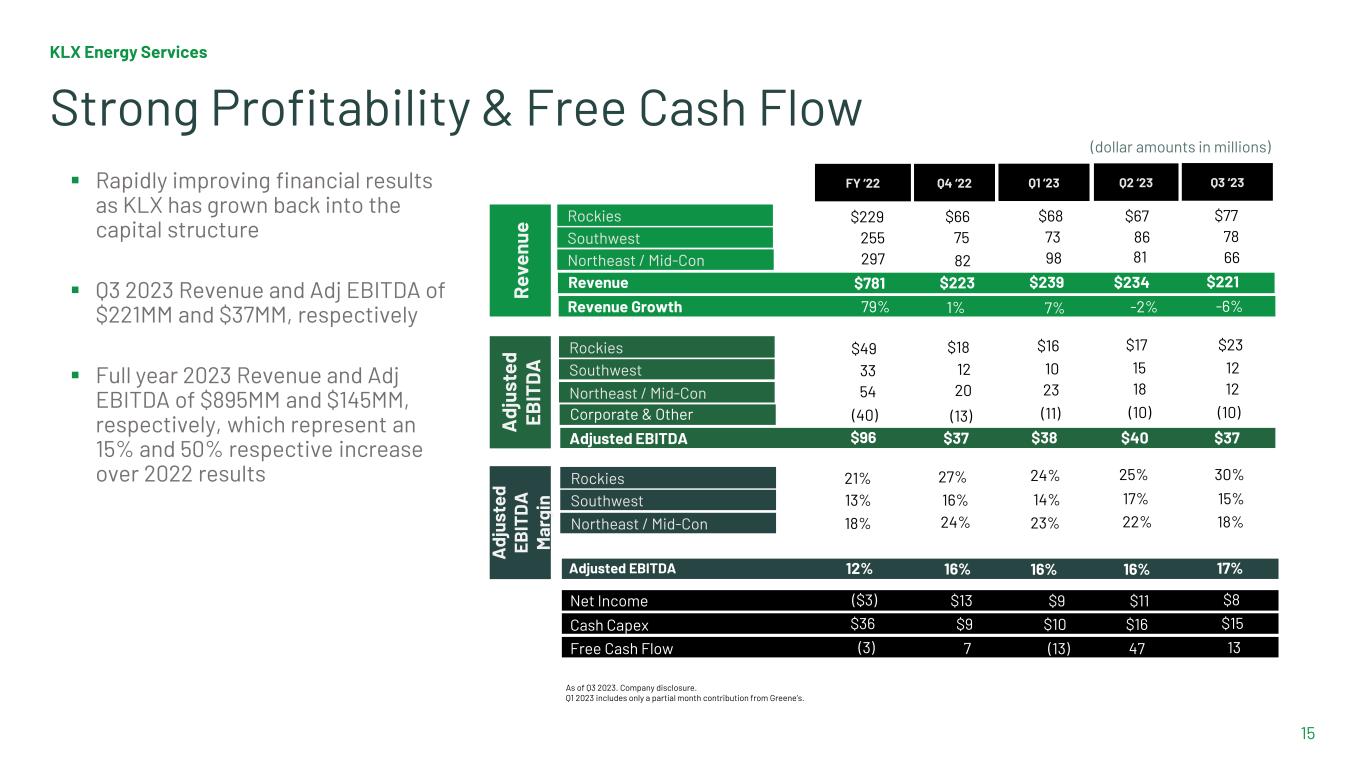 14 KLX Energy Services KLX – The Choice of Top Operators Revenue driven by top 10 customers in 2022 Significant leverage to the most active operators in the United States 760 30% Unique customers serviced in 2022 with no one customer accounting for more than 5% of 2022 revenue