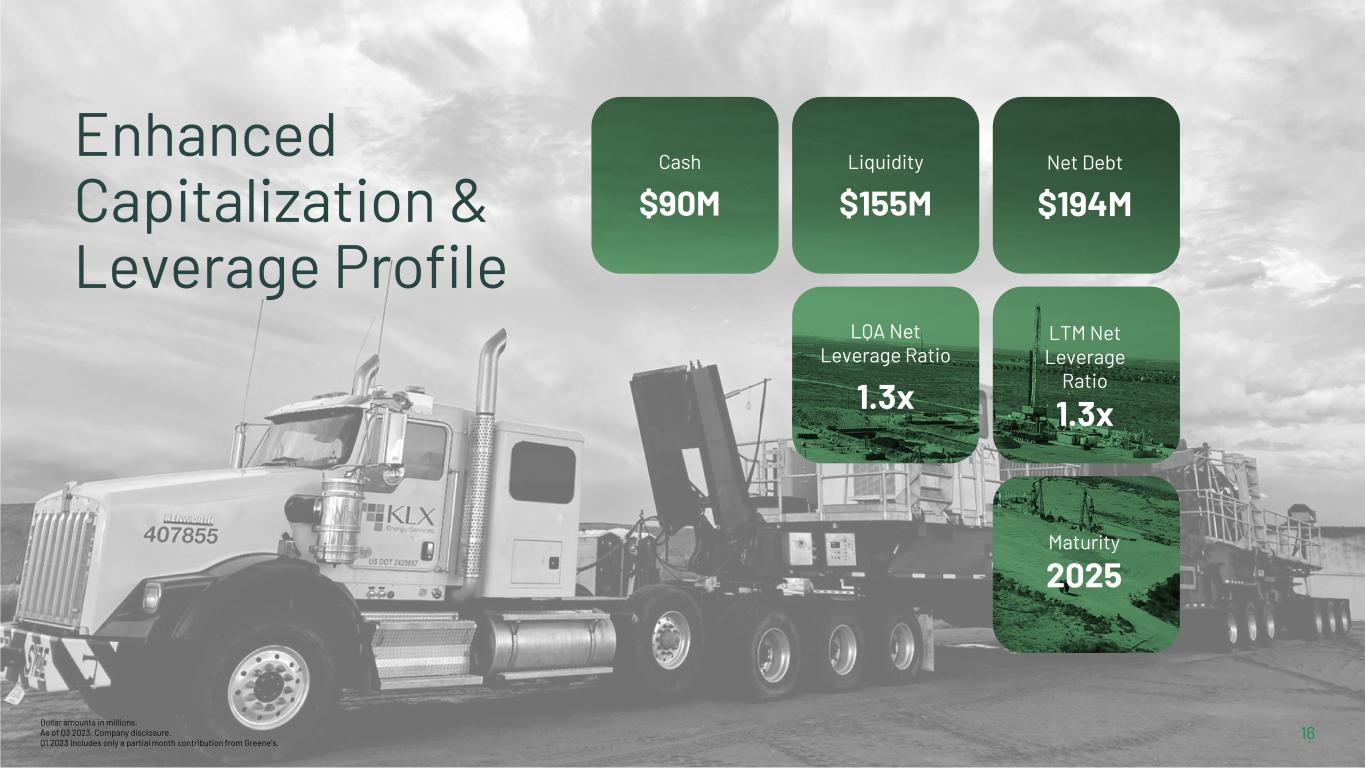 KLX Energy Services 15 Strong Profitability & Free Cash Flow  Rapidly improving financial results as KLX has grown back into the capital structure  Q3 2023 Revenue and Adj EBITDA of $221MM and $37MM, respectively  Full year 2023 Revenue and Adj EBITDA of $895MM and $145MM, respectively, which represent an 15% and 50% respective increase over 2022 results As of Q3 2023. Company disclosure. Q1 2023 includes only a partial month contribution from Greene’s. Rockies Southwest A dj us te d EB IT DA M ar gi n A dj us te d EB IT DA Re ve nu e Northeast / Mid-Con Revenue Revenue Growth Rockies Southwest Northeast / Mid-Con Corporate & Other Adjusted EBITDA Rockies Southwest Northeast / Mid-Con Adjusted EBITDA Net Income Free Cash Flow FY ‘22 $229 255 297 $781 79% $49 33 54 $96 (40) 21% 13% 18% 12% ($3) (3) $36 Q4 ‘22 Q1 ‘23 Q2 ‘23 $66 75 82 $223 1% $68 73 98 $239 7% $77 78 66 $221 -6% Q3 ‘23 $67 86 81 $234 -2% $18 12 20 $37 (13) $16 10 23 $38 (11) $17 15 18 $40 (10) $23 12 12 $37 (10) 27% 16% 24% 16% 24% 14% 23% 16% 25% 17% 22% 16% 30% 15% 18% 17% $13 $9 $11 $8 7 (13) 47 13 $9 $10 $16 $15Cash Capex (dollar amounts in millions)