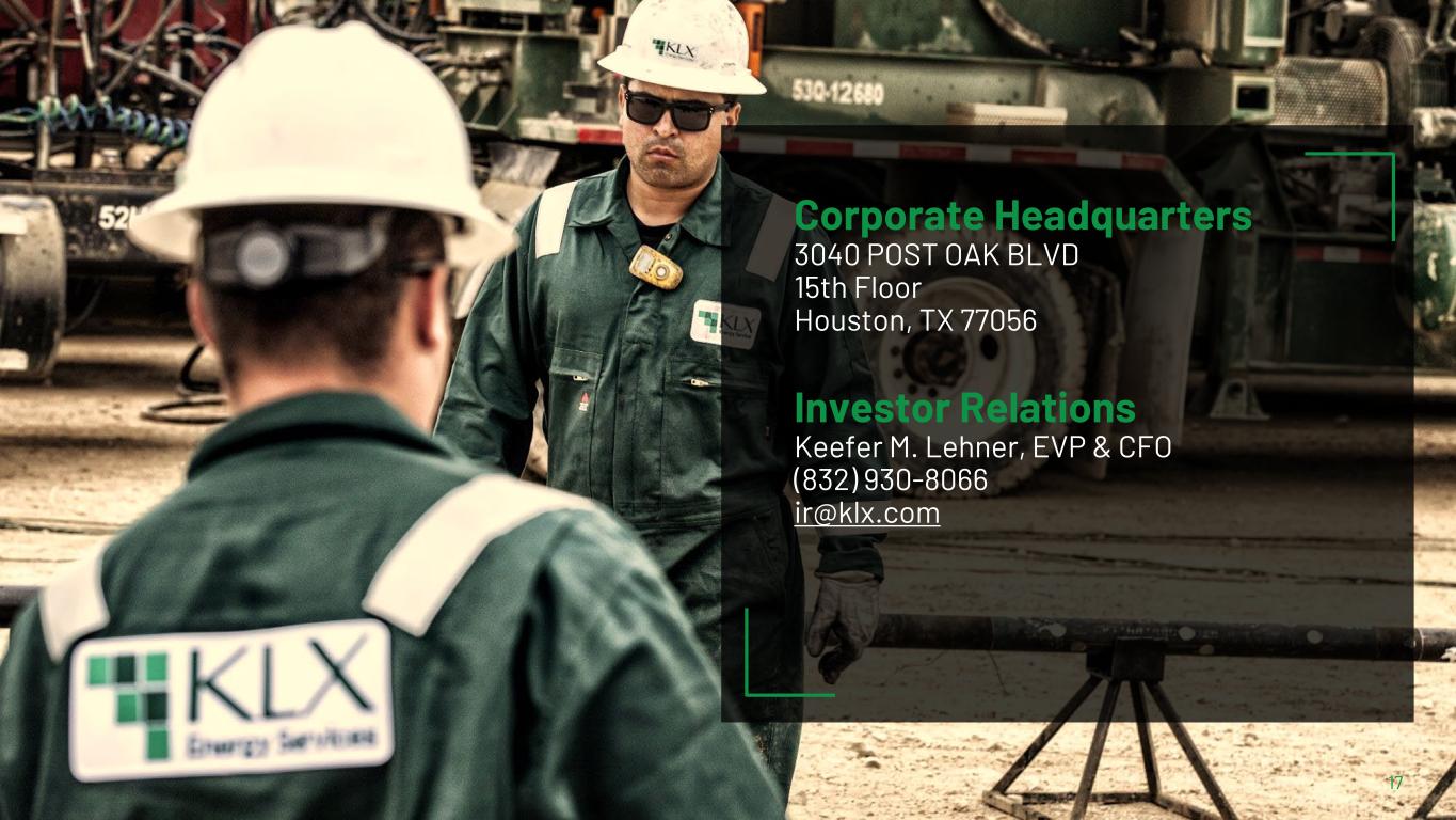 17 Corporate Headquarters 3040 POST OAK BLVD 15th Floor Houston, TX 77056 Investor Relations Keefer M. Lehner, EVP & CFO (832) 930-8066 ir@klx.com