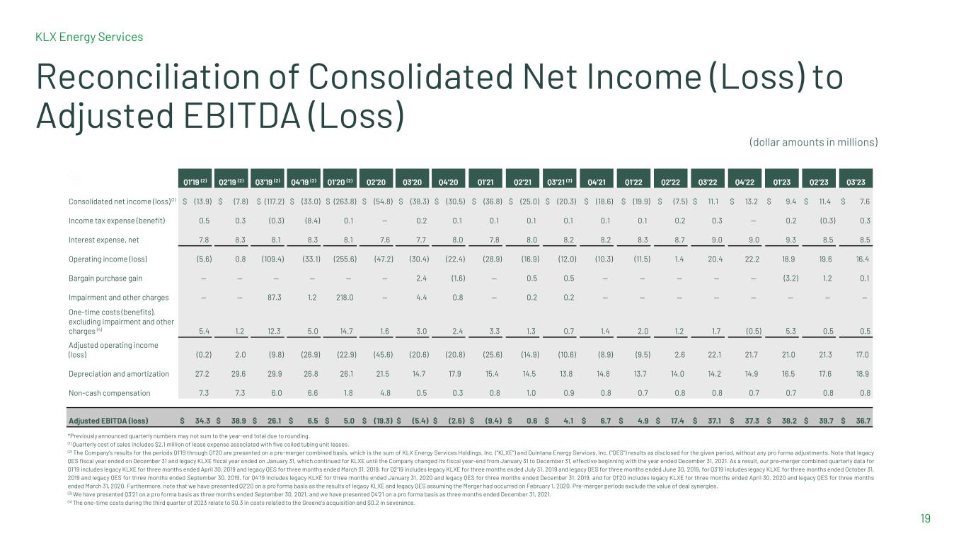 Forward-Looking Statements Cautionary Statement on Forward-looking Statements This presentation contains forward-looking statements within the meaning of Section 27A of the Securities Act of 1933, as amended, and Section 21E of the Exchange Act. This presentation includes forward- looking statements that reflect our current expectations, projections and goals relating to our future results, performance and prospects. Forward-looking statements include all statements that are not historical in nature and are not current facts, including our preliminary estimated financial information for Q4 2022. When used in this news release (and any oral statements made regarding the subjects of this release, including on the conference call announced herein), the words “believe,” “expect,” “plan,” “intend,” “anticipate,” “estimate,” “predict,” “potential,” “continue,” “may,” “might,” “should,” “could,” “will” or the negative of these terms or similar expressions are intended to identify forward-looking statements, although not all forward-looking statements contain such identifying words. Such forward-looking statements involve risks and uncertainties. These forward-looking statements are based on our current expectations and assumptions about future events and are based on currently available information as to the outcome and timing of future events with respect to, among other things: our operating cash flows; the availability of capital and our liquidity; our ability to renew and refinance our debt; our future revenue, income and operating performance; our ability to sustain and improve our utilization, revenue and margins; our ability to maintain acceptable pricing for our services; future capital expenditures; our ability to finance equipment, working capital and capital expenditures; our ability to execute our long-term growth strategy and to integrate our acquisitions; our ability to successfully develop our research and technology capabilities and implement technological developments and enhancements; and the timing and success of strategic initiatives and special projects. The Company’s actual experience and results may differ materially from the experience and results anticipated in such statements. Factors that might cause such a difference include those discussed in the Company’s filings with the U.S. Securities and Exchange Commission (the “SEC”), which include its Annual or Transition Report on Form 10-K, Quarterly Reports on Form 10-Q and Current Reports on Form 8-K. For more information, see the section entitled “Forward- Looking Statements” contained in the Company’s Transition Report on Form 10-K and in other filings. Any forward-looking statements included in this presentation are made only as of the date of this presentation and, except as required by federal securities laws and rules and regulations of the SEC, the Company undertakes no obligation to publicly update or revise any forward-looking statements, whether as a result of new information, future events or otherwise. Non-GAAP Financial Measures This presentation includes Adjusted EBITDA which is a "non-GAAP financial measure" as defined in Regulation G of the Securities Exchange Act of 1934. Adjusted EBITDA is a supplemental non-GAAP financial measure that is used by management and external users of our financial statements, such as industry analysts, investors, lenders and rating agencies. Adjusted EBITDA is not a measure of net earnings or cash flows as determined by GAAP. We define Adjusted EBITDA as net earnings (loss) before interest, taxes, depreciation and amortization, further adjusted for (i) goodwill and/or long-lived asset impairment charges, (ii) stock-based compensation expense, (iii) restructuring charges, (iv) transaction and integration costs related to acquisitions, (v) costs incurred related to the COVID-19 pandemic and (vi) other expenses or charges to exclude certain items that we believe are not reflective of ongoing performance of our business. Adjusted EBITDA is used to calculate the Company's leverage ratio, consistent with the terms of the Company's ABL facility. We believe Adjusted EBITDA is useful because it allows us to more effectively evaluate our operating performance and compare the results of our operations from period to period without regard to our financing methods or capital structure. We exclude the items listed above in arriving at Adjusted EBITDA because these amounts can vary substantially from company to company within our industry depending upon accounting methods and book values of assets, capital structures and the method by which the assets were acquired. Adjusted EBITDA should not be considered as an alternative to, or more meaningful than, net income as determined in accordance with GAAP, or as an indicator of our operating performance or liquidity. Certain items excluded from Adjusted EBITDA are significant components in understanding and assessing a company's financial performance, such as a company's cost of capital and tax structure, as well as the historic costs of depreciable assets, none of which are components of Adjusted EBITDA. Our computations of Adjusted EBITDA may not be comparable to other similarly titled measures of other companies. The Company’s results for the periods Q1’19 through Q1’20 are presented on a pre-merger combined basis, which is the sum of KLX Energy Services Holdings, Inc. (“KLXE”) and Quintana Energy Services, Inc. (“QES”) results as disclosed for the given period, without any pro forma adjustments. Note that legacy QES fiscal year ended on December 31 and legacy KLXE fiscal year ended on January 31, which continued for KLXE until the Company changed its fiscal year-end from January 31 to December 31, effective beginning with the year ended December 31, 2021. As a result, our pre-merger combined quarterly data for Q1’19 includes legacy KLXE for three months en