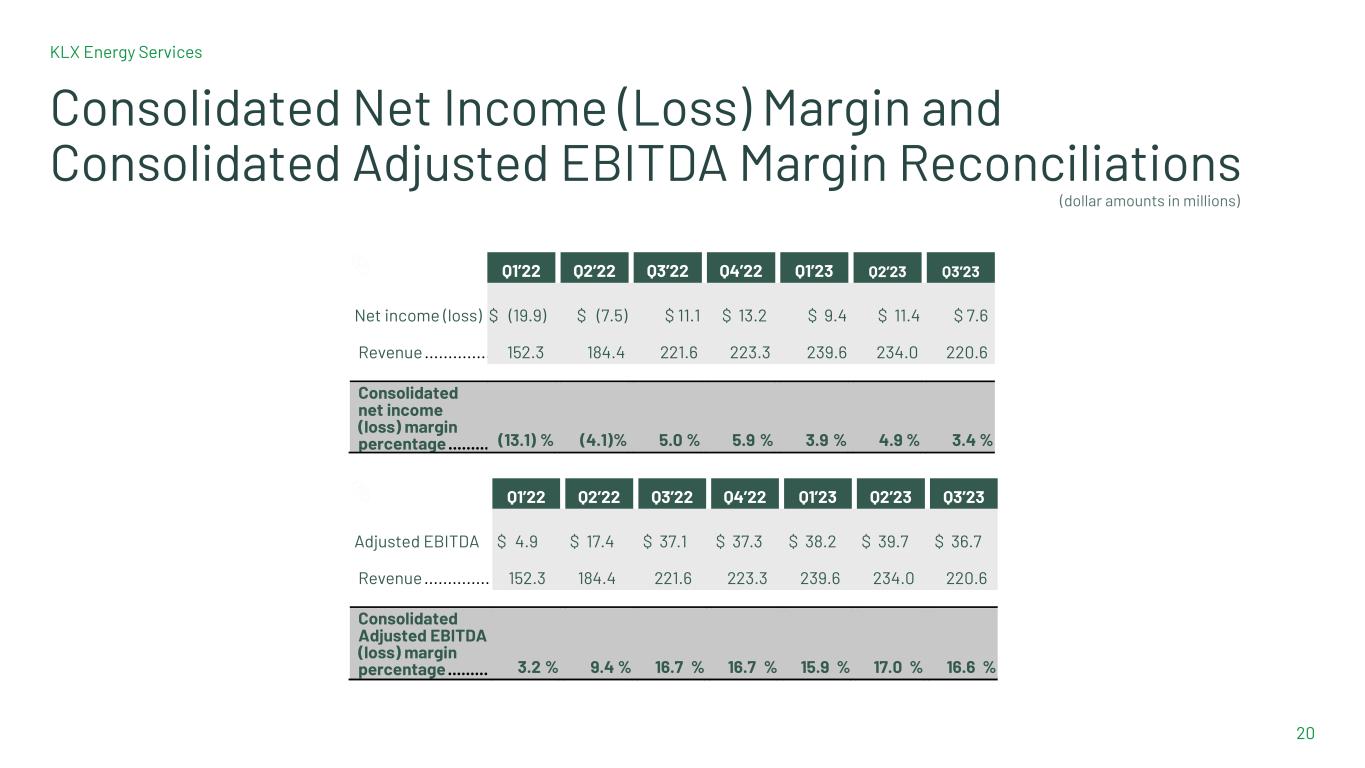 KLX Energy Services 19 Reconciliation of Consolidated Net Income (Loss) to Adjusted EBITDA (Loss) *Previously announced quarterly numbers may not sum to the year-end total due to rounding. (1) Quarterly cost of sales includes $2.1 million of lease expense associated with five coiled tubing unit leases. (2) The Company’s results for the periods Q1’19 through Q1’20 are presented on a pre-merger combined basis, which is the sum of KLX Energy Services Holdings, Inc. (“KLXE”) and Quintana Energy Services, Inc. (“QES”) results as disclosed for the given period, without any pro forma adjustments. Note that legacy QES fiscal year ended on December 31 and legacy KLXE fiscal year ended on January 31, which continued for KLXE until the Company changed its fiscal year-end from January 31 to December 31, effective beginning with the year ended December 31, 2021. As a result, our pre-merger combined quarterly data for Q1’19 includes legacy KLXE for three months ended April 30, 2019 and legacy QES for three months ended March 31, 2019, for Q2’19 includes legacy KLXE for three months ended July 31, 2019 and legacy QES for three months ended June 30, 2019, for Q3’19 includes legacy KLXE for three months ended October 31, 2019 and legacy QES for three months ended September 30, 2019, for Q4’19 includes legacy KLXE for three months ended January 31, 2020 and legacy QES for three months ended December 31, 2019, and for Q1’20 includes legacy KLXE for three months ended April 30, 2020 and legacy QES for three months ended March 31, 2020. Furthermore, note that we have presented Q2’20 on a pro forma basis as the results of legacy KLXE and legacy QES assuming the Merger had occurred on February 1, 2020. Pre-merger periods exclude the value of deal synergies. (3) We have presented Q3’21 on a pro forma basis as three months ended September 30, 2021, and we have presented Q4’21 on a pro forma basis as three months ended December 31, 2021. (4) The one-time costs during the third quarter of 2023 relate to $0.3 in costs related to the Greene’s acquisition and $0.2 in severance. Q1’19 (2) Q2’19 (2) Q3’19 (2) Q4’19 (2) Q1’20 (2) Q2’20 Q3’20 Q4’20 Q1’21 Q2’21 Q3’21 (3) Q4’21 Q1’22 Q2’22 Q3’22 Q4’22 Q1’23 Q2’23 Q3’23 Consolidated net income (loss) (1) $ (13.9) $ (7.8) $ (117.2) $ (33.0) $ (263.8) $ (54.8) $ (38.3) $ (30.5) $ (36.8) $ (25.0) $ (20.3) $ (18.6) $ (19.9) $ (7.5) $ 11.1 $ 13.2 $ 9.4 $ 11.4 $ 7.6 Income tax expense (benefit) 0.5 0.3 (0.3) (8.4) 0.1 — 0.2 0.1 0.1 0.1 0.1 0.1 0.1 0.2 0.3 — 0.2 (0.3) 0.3 Interest expense, net 7.8 8.3 8.1 8.3 8.1 7.6 7.7 8.0 7.8 8.0 8.2 8.2 8.3 8.7 9.0 9.0 9.3 8.5 8.5 Operating income (loss) (5.6) 0.8 (109.4) (33.1) (255.6) (47.2) (30.4) (22.4) (28.9) (16.9) (12.0) (10.3) (11.5) 1.4 20.4 22.2 18.9 19.6 16.4 Bargain purchase gain — — — — — — 2.4 (1.6) — 0.5 0.5 — — — — — (3.2) 1.2 0.1 Impairment and other charges — — 87.3 1.2 218.0 — 4.4 0.8 — 0.2 0.2 — — — — — — — — One-time costs (benefits), excluding impairment and other charges (4) 5.4 1.2 12.3 5.0 14.7 1.6 3.0 2.4 3.3 1.3 0.7 1.4 2.0 1.2 1.7 (0.5) 5.3 0.5 0.5 Adjusted operating income (loss) (0.2) 2.0 (9.8) (26.9) (22.9) (45.6) (20.6) (20.8) (25.6) (14.9) (10.6) (8.9) (9.5) 2.6 22.1 21.7 21.0 21.3 17.0 Depreciation and amortization 27.2 29.6 29.9 26.8 26.1 21.5 14.7 17.9 15.4 14.5 13.8 14.8 13.7 14.0 14.2 14.9 16.5 17.6 18.9 Non-cash compensation 7.3 7.3 6.0 6.6 1.8 4.8 0.5 0.3 0.8 1.0 0.9 0.8 0.7 0.8 0.8 0.7 0.7 0.8 0.8 Adjusted EBITDA (loss) $ 34.3 $ 38.9 $ 26.1 $ 6.5 $ 5.0 $ (19.3) $ (5.4) $ (2.6) $ (9.4) $ 0.6 $ 4.1 $ 6.7 $ 4.9 $ 17.4 $ 37.1 $ 37.3 $ 38.2 $ 39.7 $ 36.7 (dollar amounts in millions)