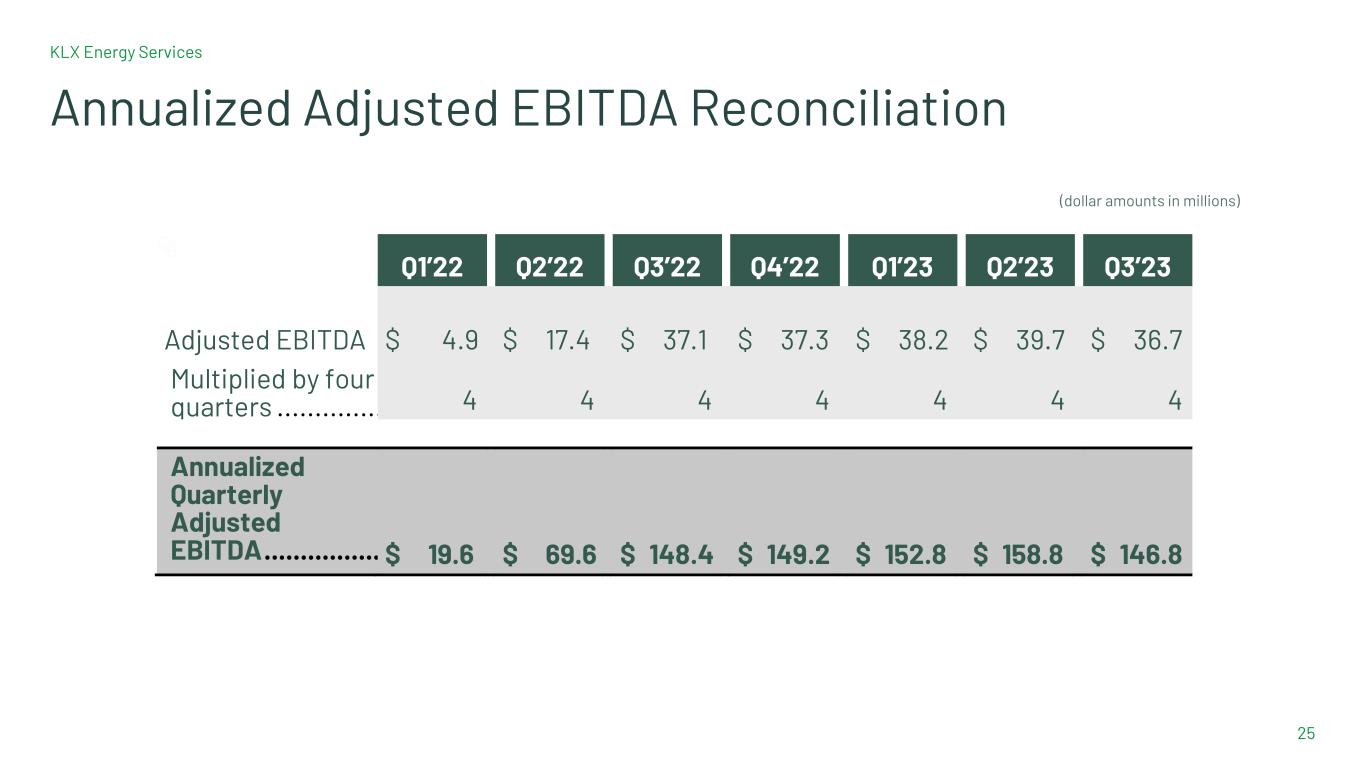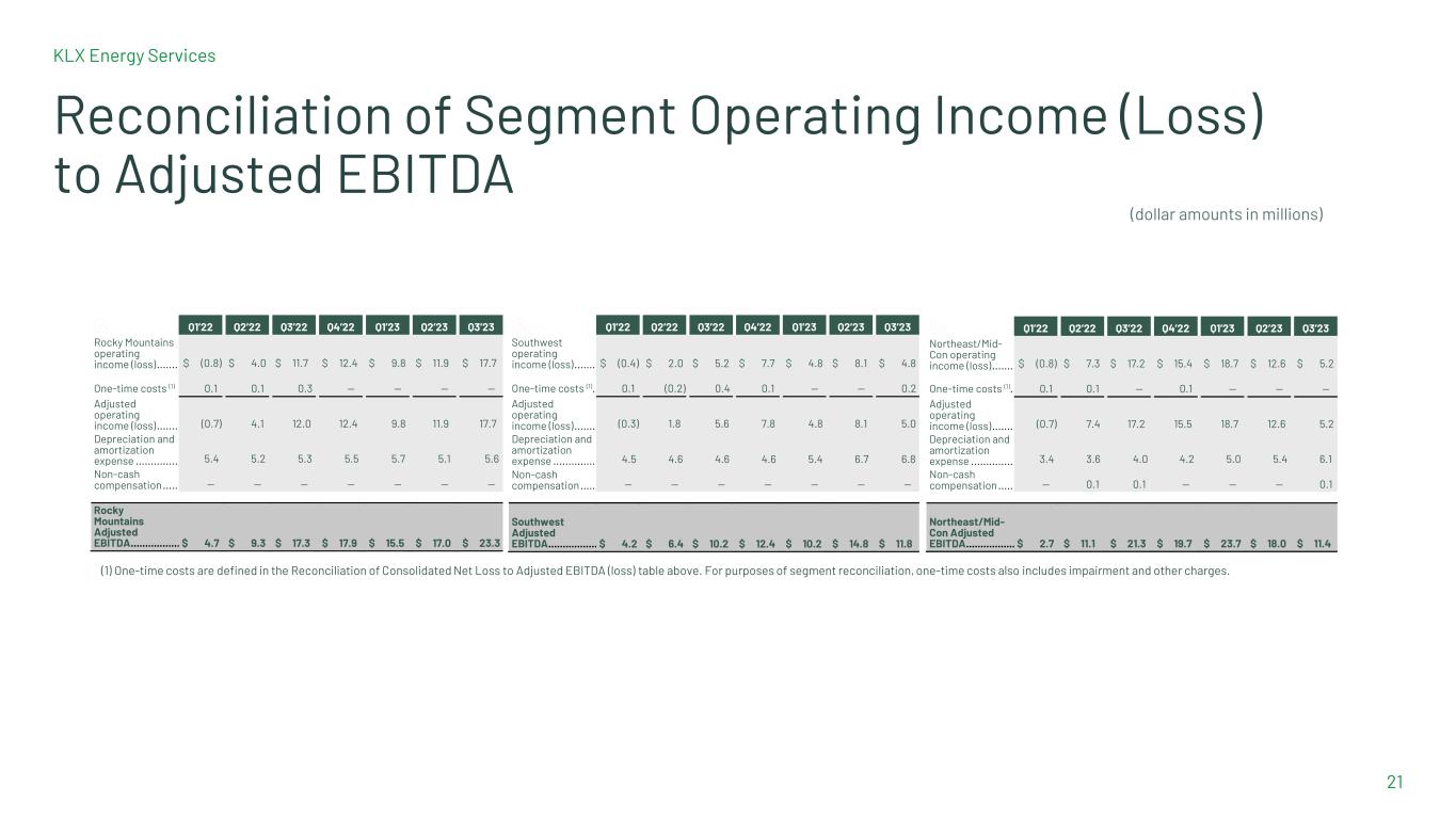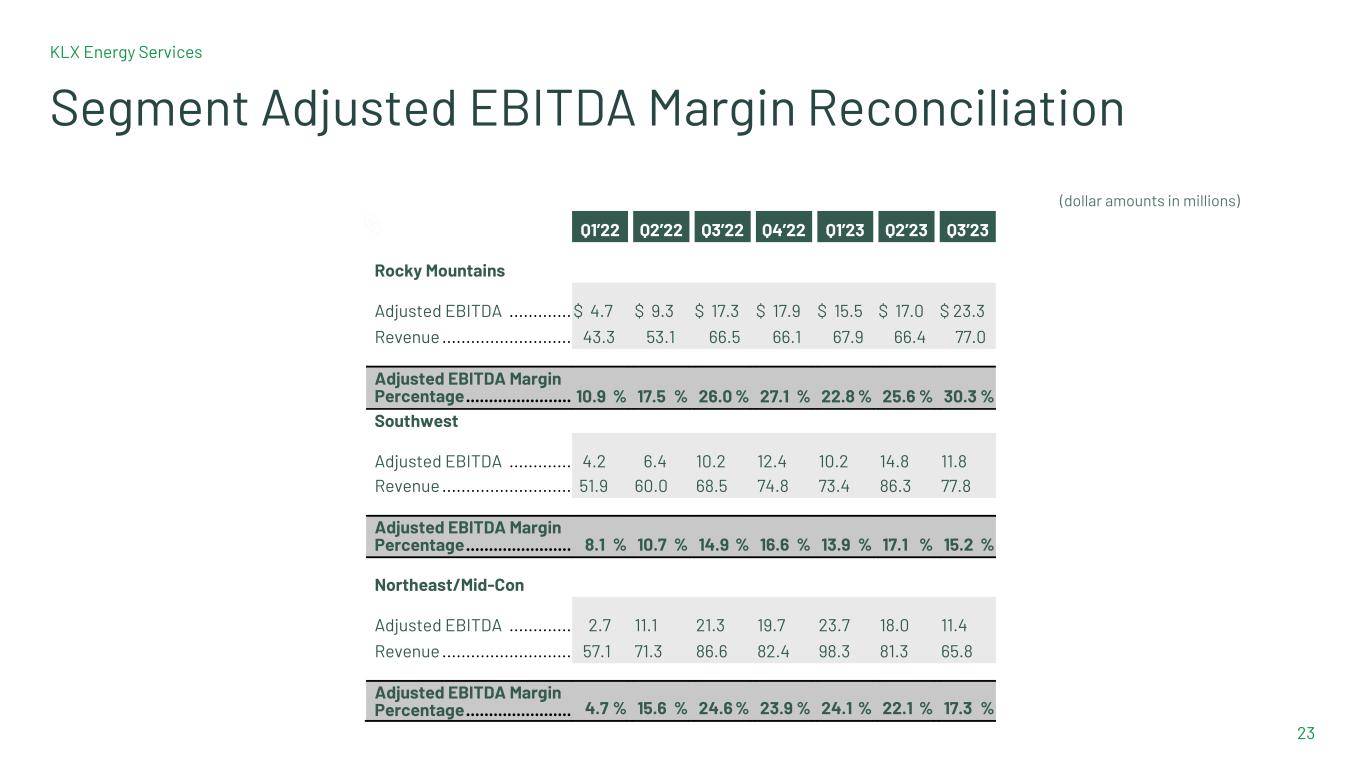 KLX Energy Services 22 Segment Operating Income (Loss) Margin Reconciliation Q1’22 Q2’22 Q3’22 Q4’22 Q1’23 Q2’23 Q3’23 Rocky Mountains Operating income (loss) .... $ (0.8) $ 4.0 $ 11.7 $ 12.4 $ 9.8 $ 11.9 $ 17.7 Revenue ........................... 43.3 53.1 66.5 66.1 67.9 66.4 77.0 Segment operating income (loss) margin percentage ....................... (1.8) % 7.5 % 17.6 % 18.8 % 14.4 % 17.9 % 23.0 % Southwest Operating income (loss) .... (0.4) 2.0 5.2 7.7 4.8 8.1 4.8 Revenue ........................... 51.9 60.0 68.5 74.8 73.4 86.3 77.8 Segment operating income (loss) margin percentage ....................... (0.8)% 3.3 % 7.6 % 10.3 % 6.5 % 9.4 % 6.2 % Northeast/Mid-Con Operating income (loss) .... (0.8) 7.3 17.2 15.4 18.7 12.6 5.2 Revenue ........................... 57.1 71.3 86.6 82.4 98.3 81.3 65.8 Segment operating income (loss) margin percentage ........................ (1.4) % 10.2 % 19.9 % 18.7 % 19.0 % 15.5 % 7.9 % (dollar amounts in millions)