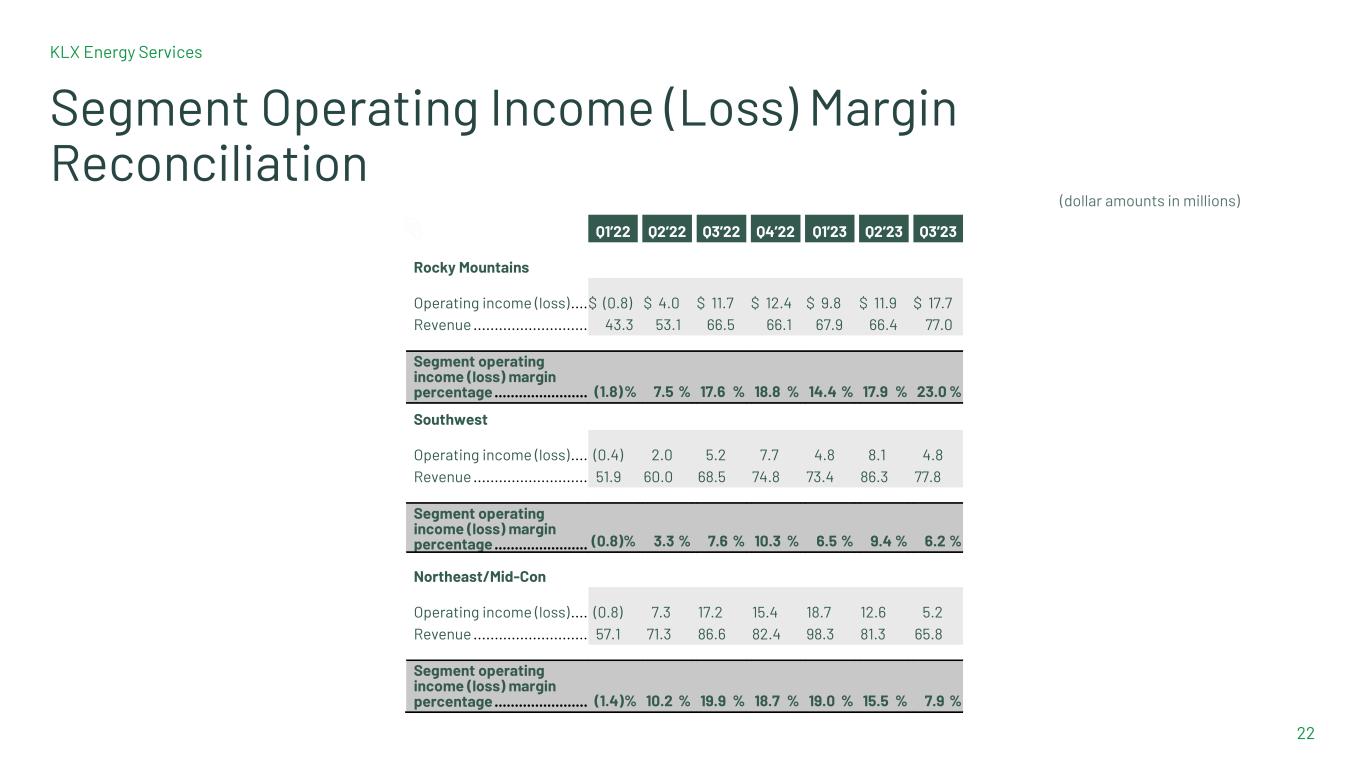 KLX Energy Services 21 Reconciliation of Segment Operating Income (Loss) to Adjusted EBITDA Q1’22 Q2’22 Q3’22 Q4’22 Q1’23 Q2’23 Q3’23 Rocky Mountains operating income (loss) ........ $ (0.8) $ 4.0 $ 11.7 $ 12.4 $ 9.8 $ 11.9 $ 17.7 One-time costs (1) 0.1 0.1 0.3 — — — — Adjusted operating income (loss) ........ (0.7) 4.1 12.0 12.4 9.8 11.9 17.7 Depreciation and amortization expense ............... 5.4 5.2 5.3 5.5 5.7 5.1 5.6 Non-cash compensation ...... — — — — — — — Rocky Mountains Adjusted EBITDA ................. $ 4.7 $ 9.3 $ 17.3 $ 17.9 $ 15.5 $ 17.0 $ 23.3 (1) One-time costs are defined in the Reconciliation of Consolidated Net Loss to Adjusted EBITDA (loss) table above. For purposes of segment reconciliation, one-time costs also includes impairment and other charges. (dollar amounts in millions) Q1’22 Q2’22 Q3’22 Q4’22 Q1’23 Q2’23 Q3’23 Southwest operating income (loss) ........ $ (0.4) $ 2.0 $ 5.2 $ 7.7 $ 4.8 $ 8.1 $ 4.8 One-time costs (1) .. 0.1 (0.2) 0.4 0.1 — — 0.2 Adjusted operating income (loss) ........ (0.3) 1.8 5.6 7.8 4.8 8.1 5.0 Depreciation and amortization expense ............... 4.5 4.6 4.6 4.6 5.4 6.7 6.8 Non-cash compensation ...... — — — — — — — Southwest Adjusted EBITDA ................. $ 4.2 $ 6.4 $ 10.2 $ 12.4 $ 10.2 $ 14.8 $ 11.8 Q1’22 Q2’22 Q3’22 Q4’22 Q1’23 Q2’23 Q3’23 Northeast/Mid- Con operating income (loss) ........ $ (0.8) $ 7.3 $ 17.2 $ 15.4 $ 18.7 $ 12.6 $ 5.2 One-time costs (1) .. 0.1 0.1 — 0.1 — — — Adjusted operating income (loss) ........ (0.7) 7.4 17.2 15.5 18.7 12.6 5.2 Depreciation and amortization expense ............... 3.4 3.6 4.0 4.2 5.0 5.4 6.1 Non-cash compensation ...... — 0.1 0.1 — — — 0.1 Northeast/Mid- Con Adjusted EBITDA ................. $ 2.7 $ 11.1 $ 21.3 $ 19.7 $ 23.7 $ 18.0 $ 11.4